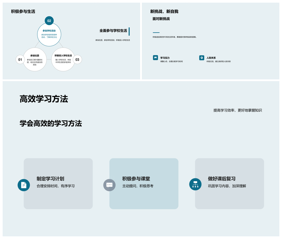 这是一张高一新生适应指南学业规划校园社团高效学习PPT模板,包含高一新生、适应指南、学业规划、校园社团、高效学习等主题内容,也可用作高一新生适应指南学业规划校园社团、适应指南学业规划校园社团高效学习、高一新生适应指南学业规划、适应指南学业规划校园社团、学业规划校园社团高效学习、高一新生适应指南学业、适应指南学业规划校园、学业规划校园社团高效、高一新生适应指南、适应指南学业规划、学业规划校园社团、校园社团高效学习、高一新生学业规划、适应指南校园社团、学业规划高效学习等PPT场景使用。 风云办公提供的高一新生适应指南学业规划校园社团高效学习PPT模板,下载格式为pptx,一共31页,作品中文字及图均可以修改和编辑,图片更改请在作品中右键图片并更换,文字修改请直接点击文字进行修改。