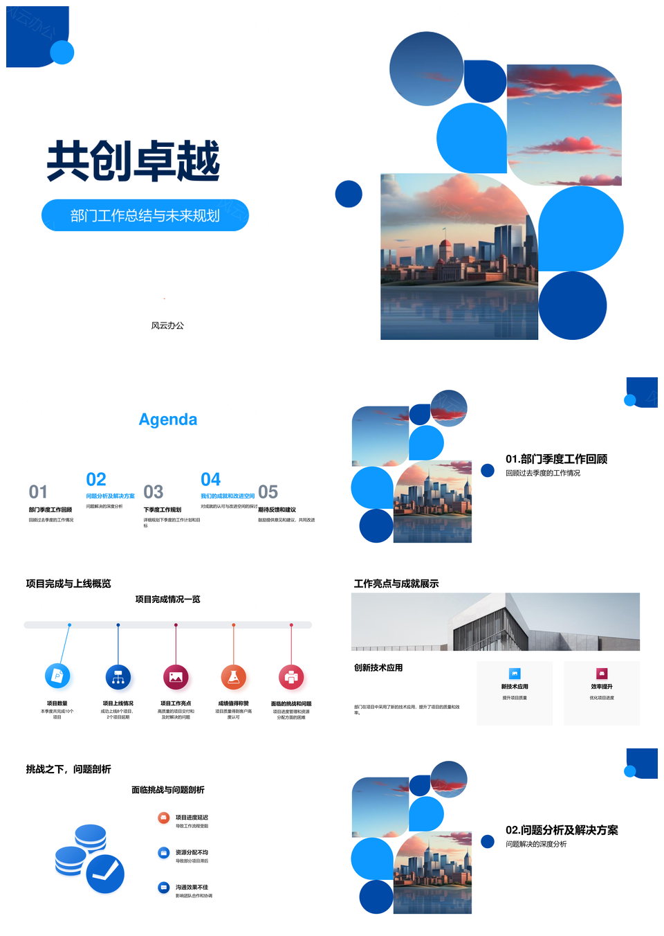风云办公提供的部门工作总结未来规划共创卓越PPT模板,下载格式为pptx,一共23页,作品中文字及图均可以修改和编辑,图片更改请在作品中右键图片并更换,文字修改请直接点击文字进行修改。