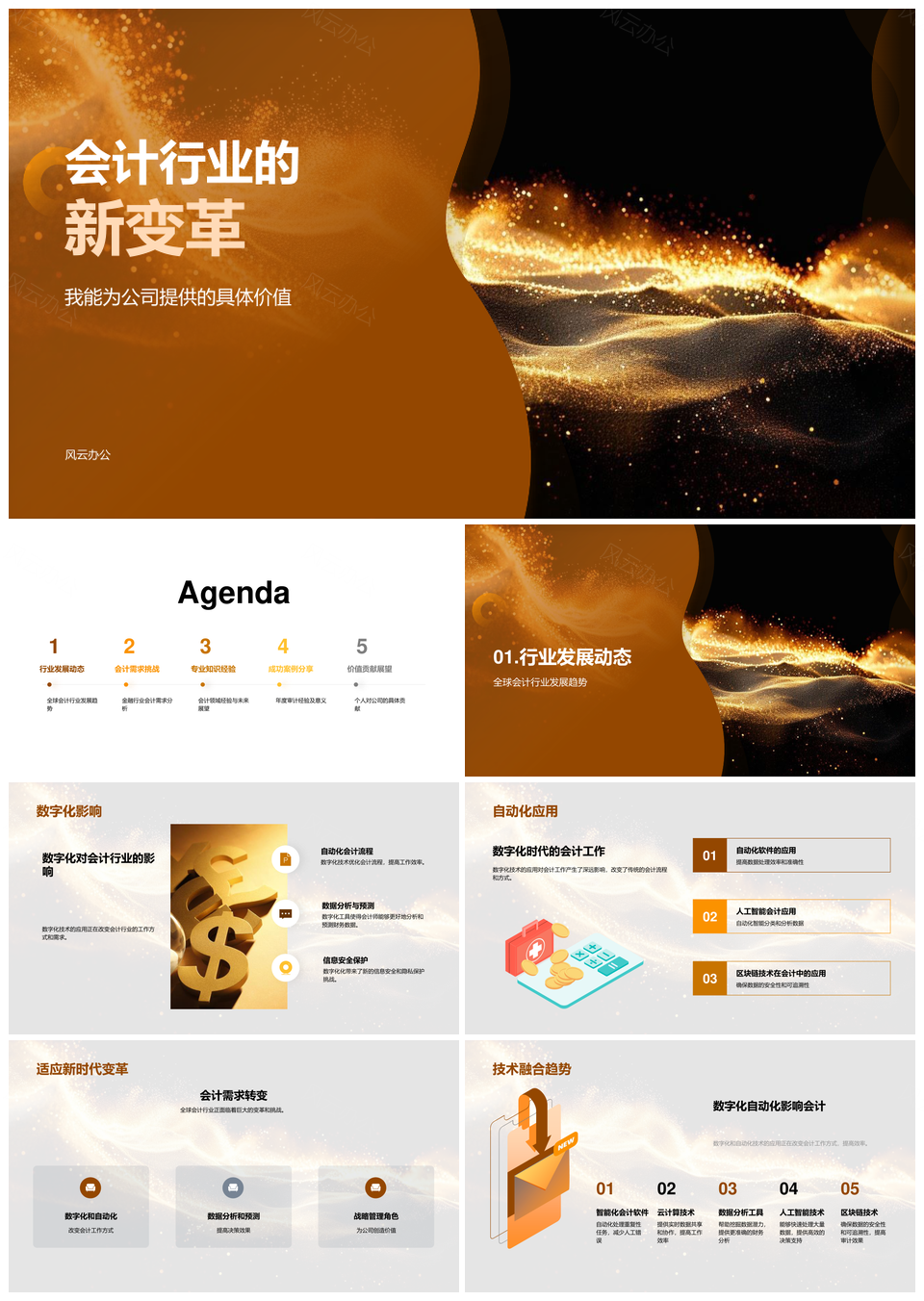 风云办公提供的会计行业数字化自动化新变革金融价值PPT模板,下载格式为pptx,一共33页,作品中文字及图均可以修改和编辑,图片更改请在作品中右键图片并更换,文字修改请直接点击文字进行修改。
