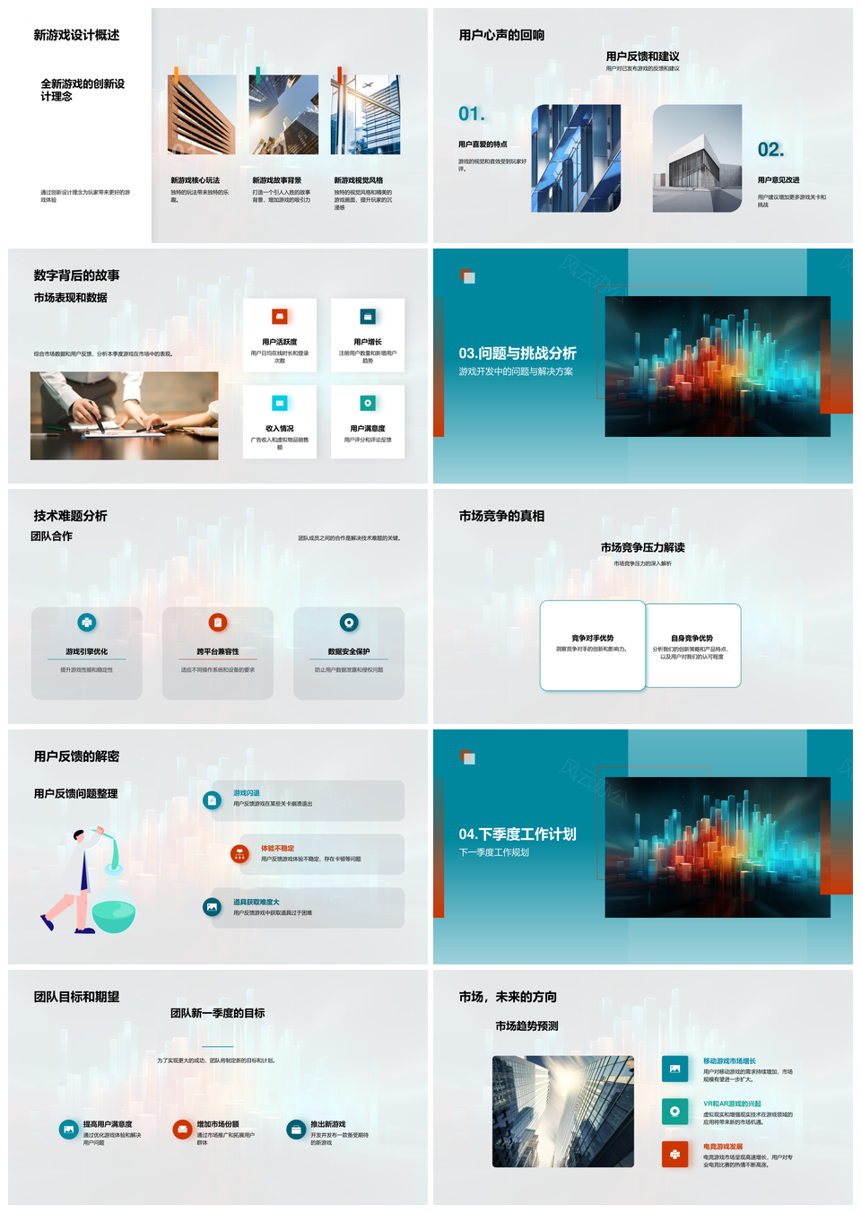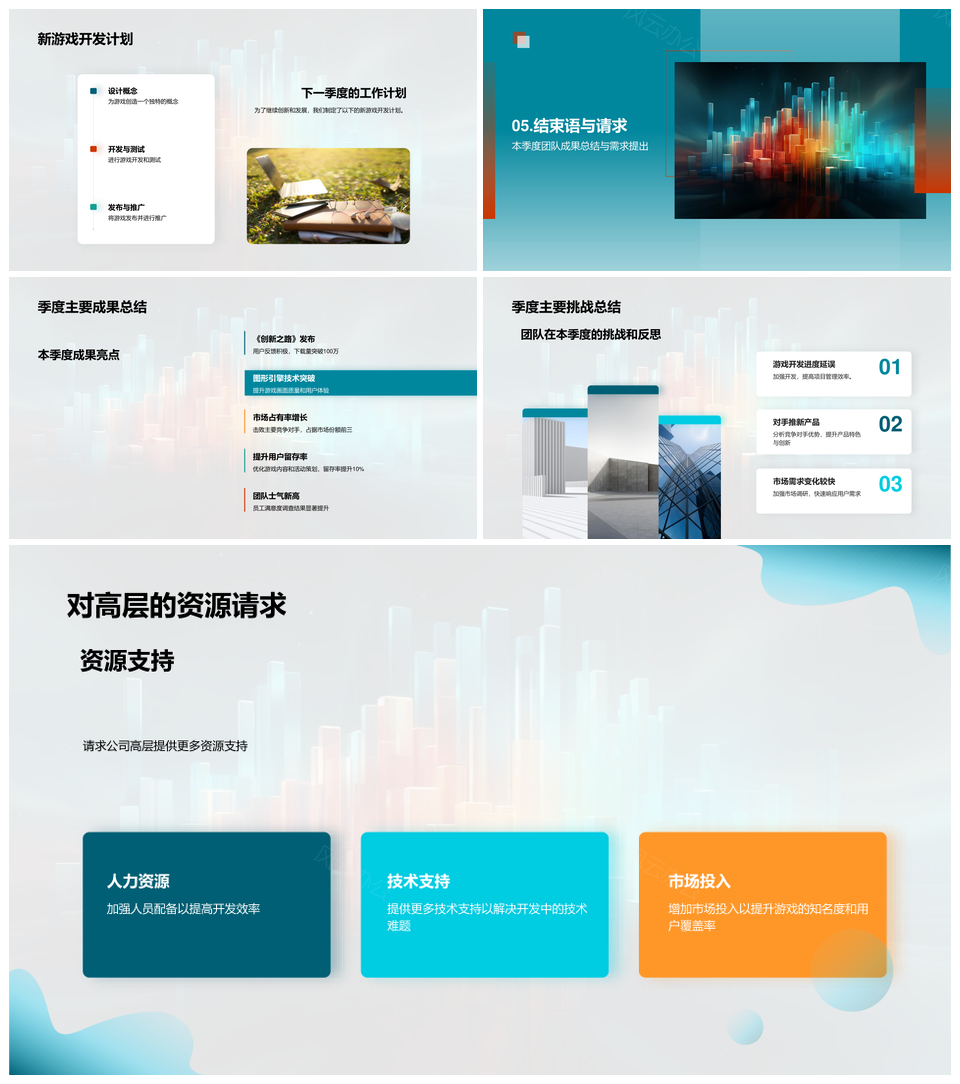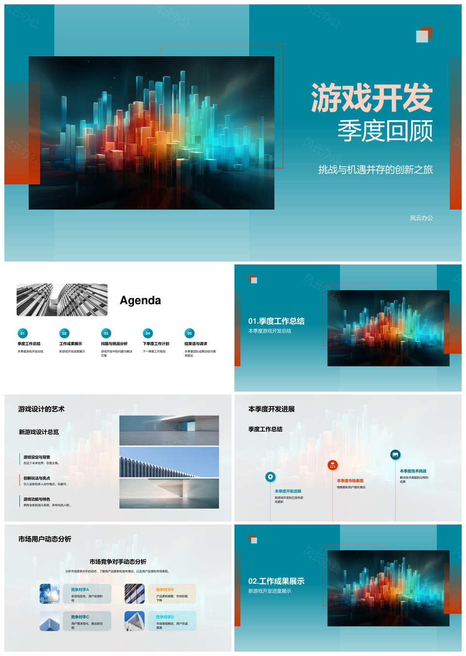 风云办公提供的游戏开发季度市场用户技术动向回顾PPT模板,下载格式为pptx,一共23页,作品中文字及图均可以修改和编辑,图片更改请在作品中右键图片并更换,文字修改请直接点击文字进行修改。