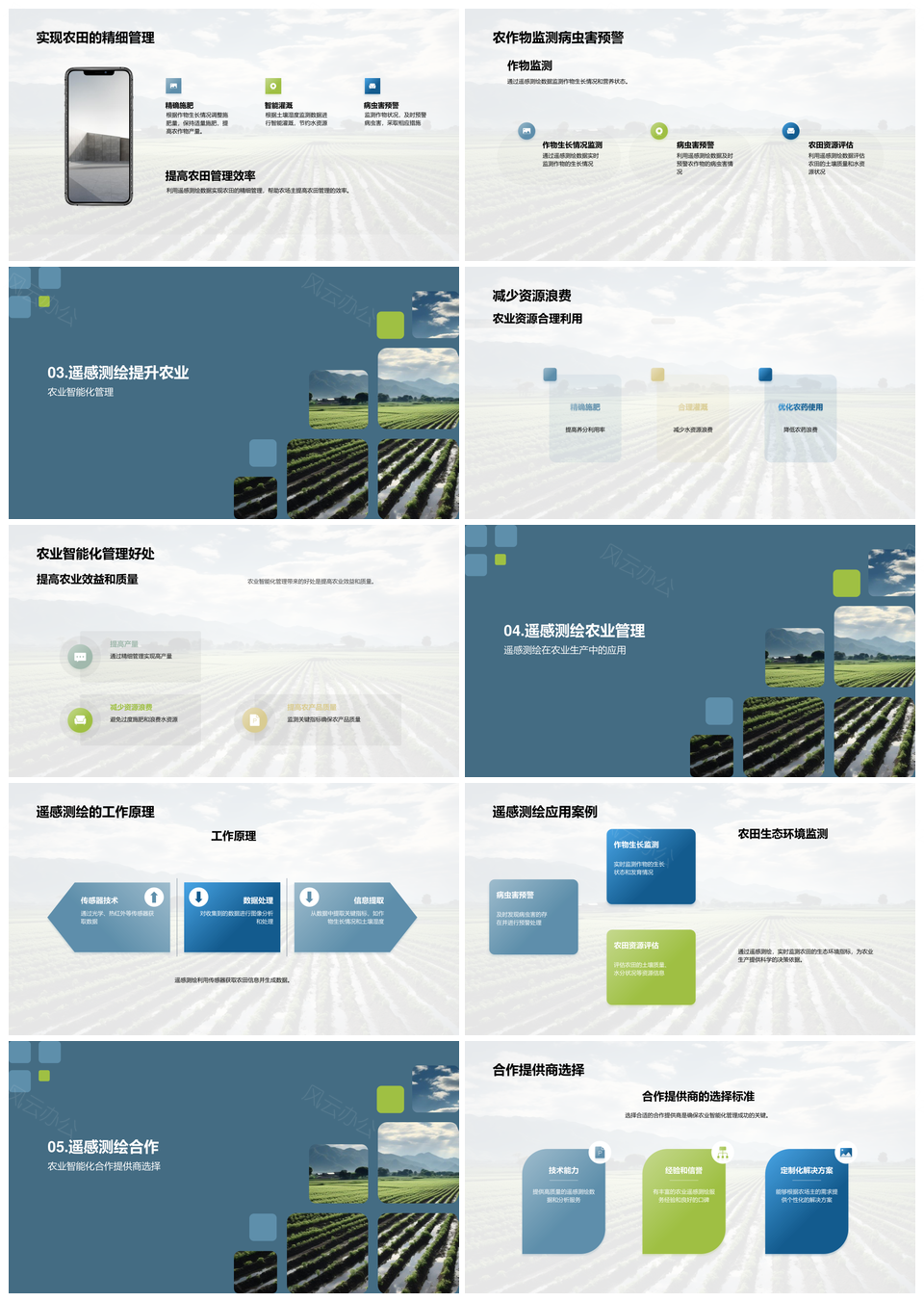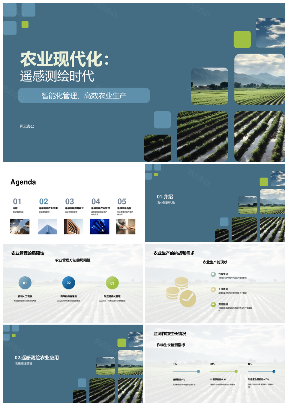 风云办公提供的农业智能化遥感测绘助力农田管理PPT模板,下载格式为pptx,一共19页,作品中文字及图均可以修改和编辑,图片更改请在作品中右键图片并更换,文字修改请直接点击文字进行修改。