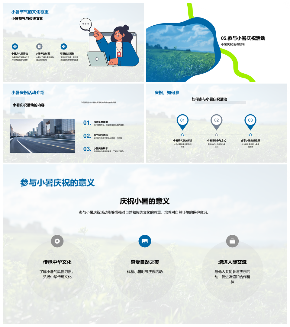 这是一张小暑节气中小学生识传统节气历史天气活动PPT模板,包含小暑、节气、中小学生、识、传统、节气历史、天气、活动等主题内容,也可用作小暑节气中小学生传统节气、节气中小学生传统历史天气、中小学生传统节气历史、小暑节气历史天气活动、传统节气历史天气活动、小暑节气中小学生活动、节气传统历史天气活动、中小学生传统历史天气、小暑节气传统天气活动、节气中小学生历史天气、中小学生传统节气历史、小暑节气传统节气历史、传统历史天气活动、节气历史天气活动、小暑中小学生活动等PPT场景使用。 风云办公提供的小暑节气中小学生识传统节气历史天气活动PPT模板,下载格式为pptx,一共23页,作品中文字及图均可以修改和编辑,图片更改请在作品中右键图片并更换,文字修改请直接点击文字进行修改。