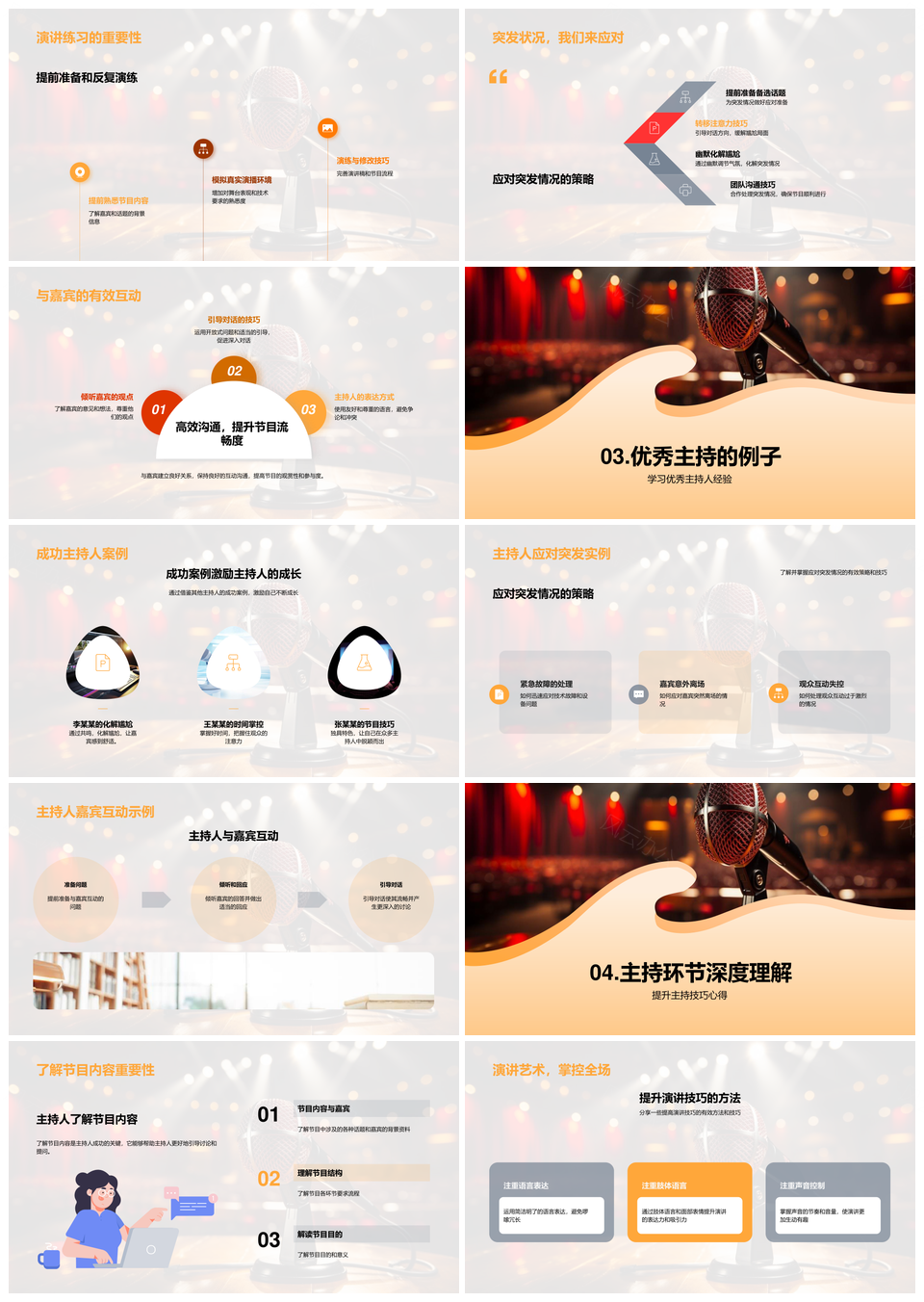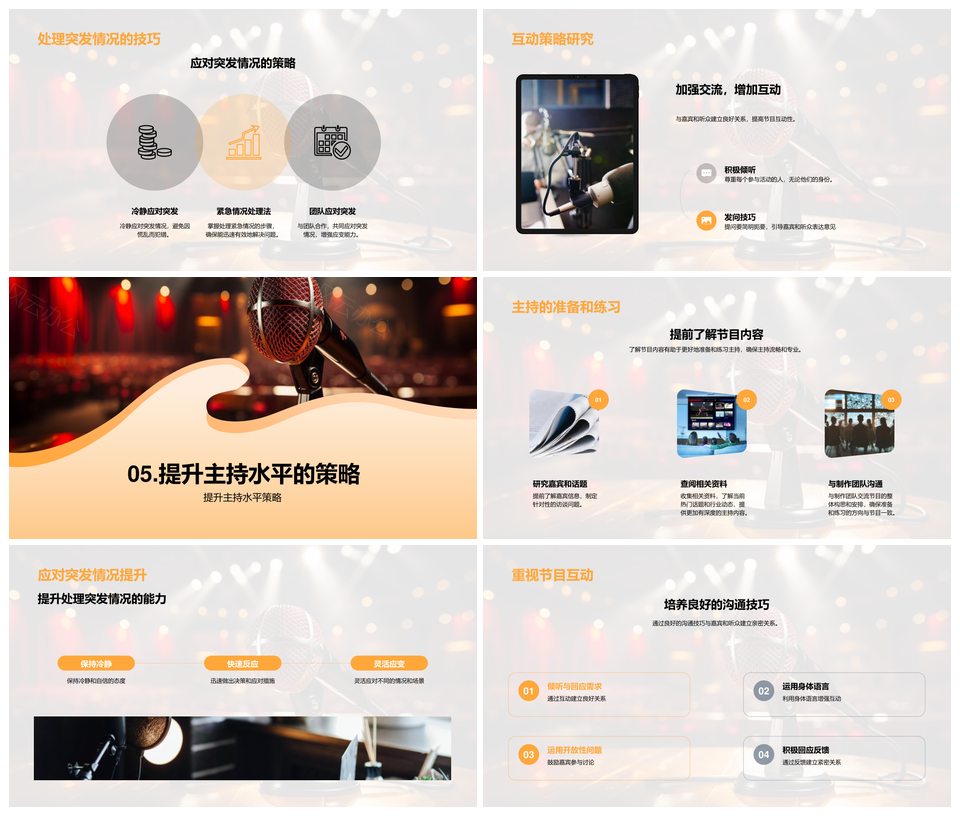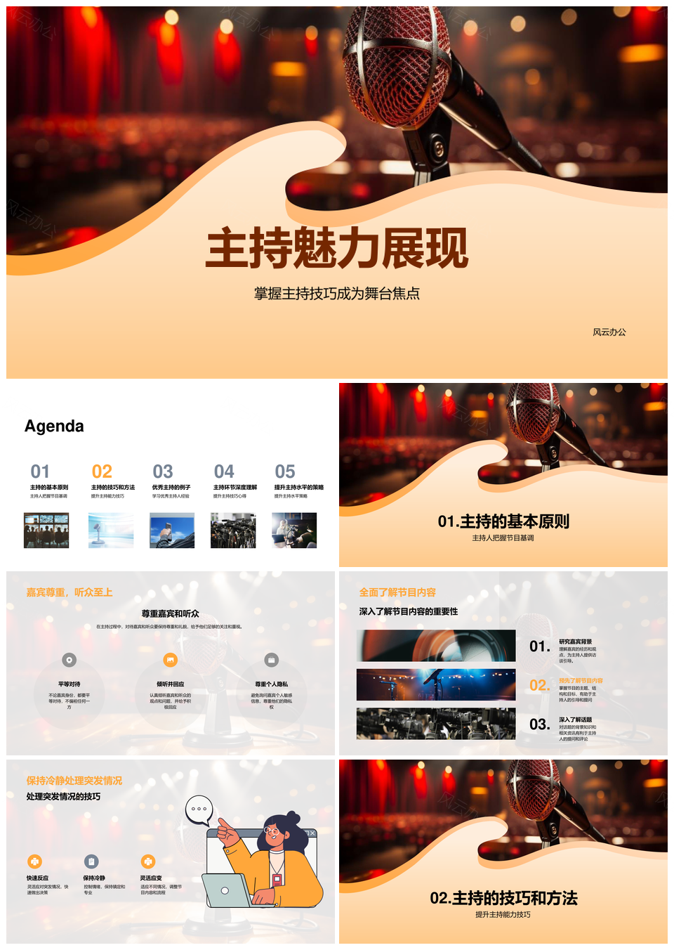 风云办公提供的主持魅力技巧互动应变掌控麦克风PPT模板,下载格式为pptx,一共24页,作品中文字及图均可以修改和编辑,图片更改请在作品中右键图片并更换,文字修改请直接点击文字进行修改。