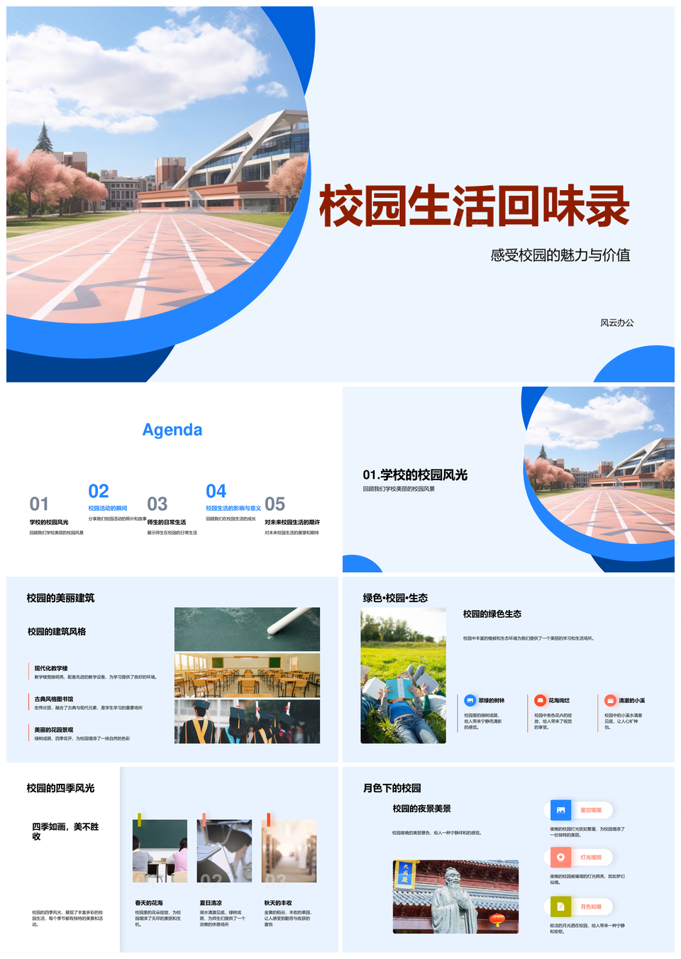 风云办公提供的校园生活师生活动建筑掠影PPT模板,下载格式为pptx,一共28页,作品中文字及图均可以修改和编辑,图片更改请在作品中右键图片并更换,文字修改请直接点击文字进行修改。