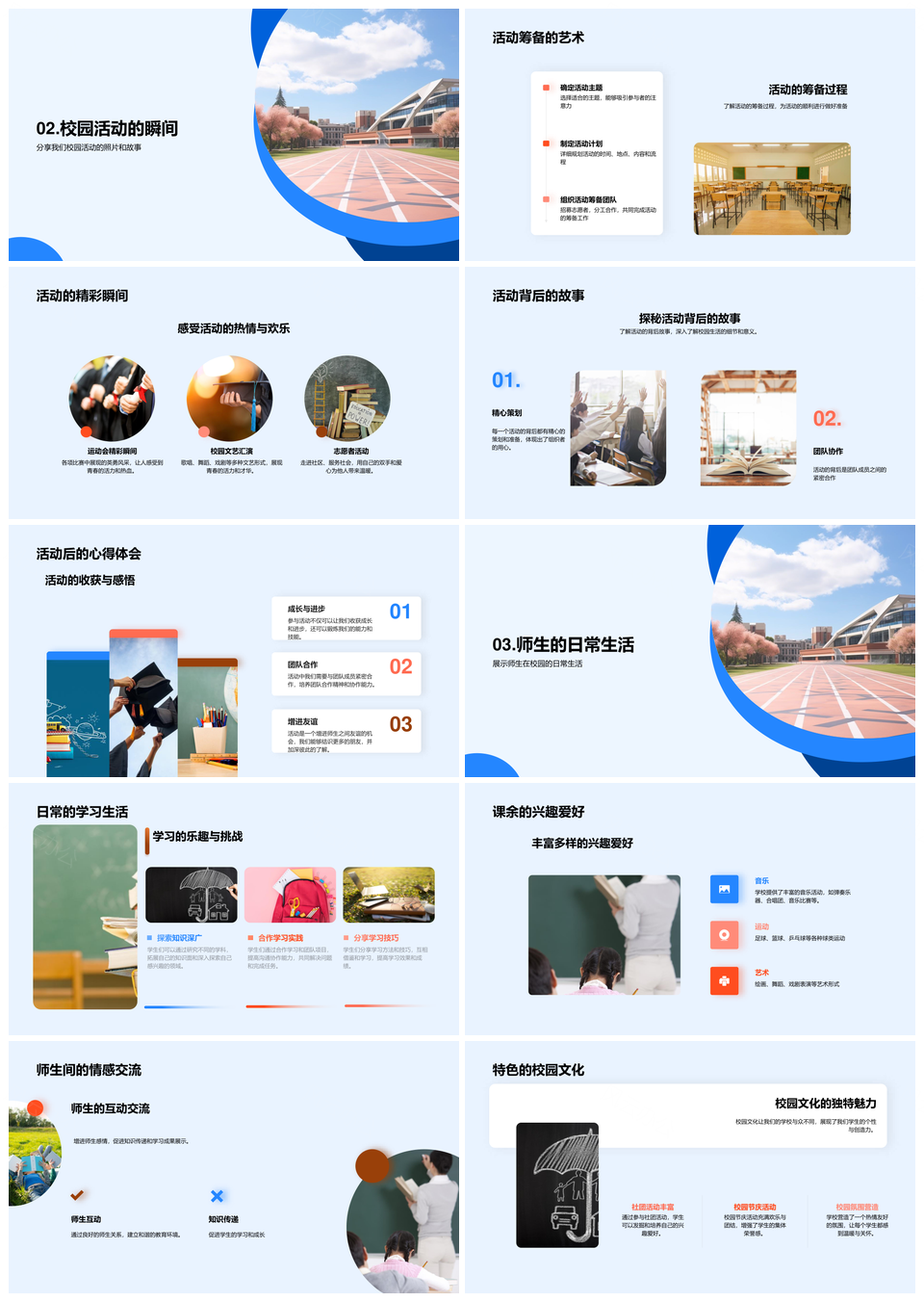 这是一张校园生活师生活动建筑掠影PPT模板,包含校园生活、师生、活动、建筑、掠影等主题内容,也可用作校园生活师生活动建筑掠影、校园生活师生活动、师生活动建筑掠影、校园师生活动建筑、校园活动建筑掠影、校园生活师生、校园生活活动、师生活动建筑、活动建筑掠影、校园建筑掠影、校园活动建筑、校园生活、师生活动、活动建筑、建筑掠影等PPT场景使用。