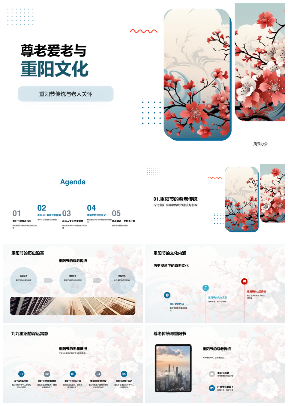 风云办公提供的重阳尊老爱老传承智慧共筑社区和谐PPT模板,下载格式为pptx,一共33页,作品中文字及图均可以修改和编辑,图片更改请在作品中右键图片并更换,文字修改请直接点击文字进行修改。
