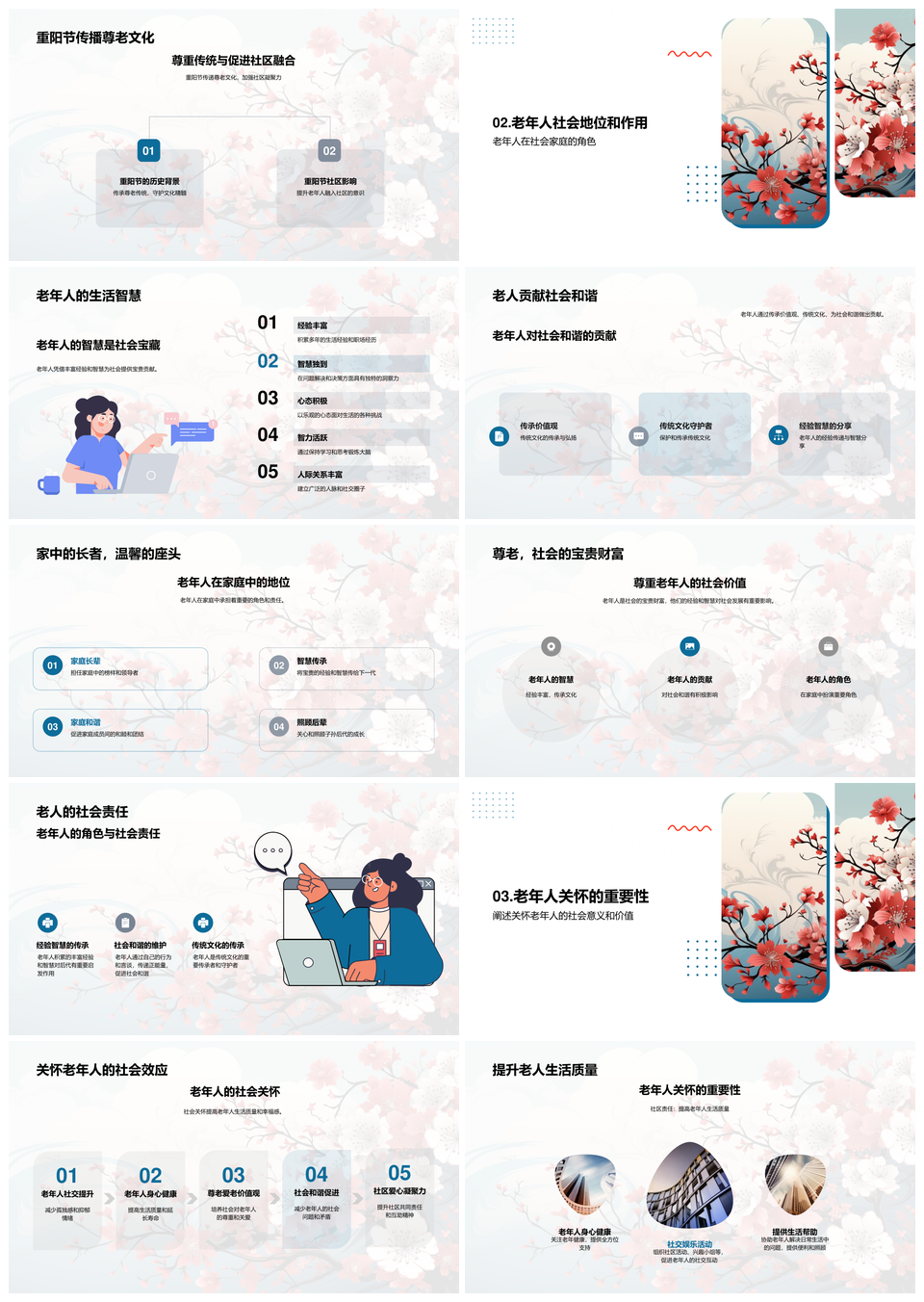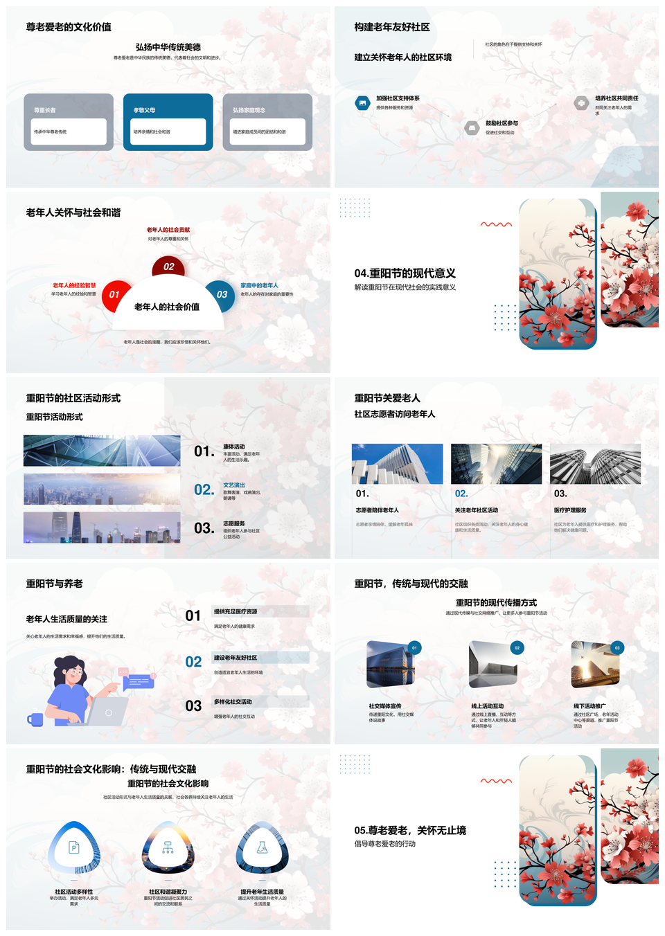 这是一张重阳尊老爱老传承智慧共筑社区和谐PPT模板,包含重阳、尊老、爱老、传承、智慧、共筑、社区、和谐等主题内容,也可用作重阳尊老爱老传承、尊老爱老传承智慧、传承智慧共筑社区、智慧共筑社区和谐、重阳尊老爱老、尊老爱老传承、爱老传承智慧、共筑社区和谐、重阳尊老、尊老爱老、爱老传承、传承智慧、智慧共筑、共筑社区、社区和谐等PPT场景使用。
