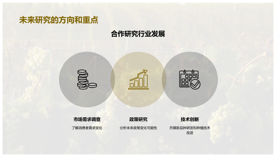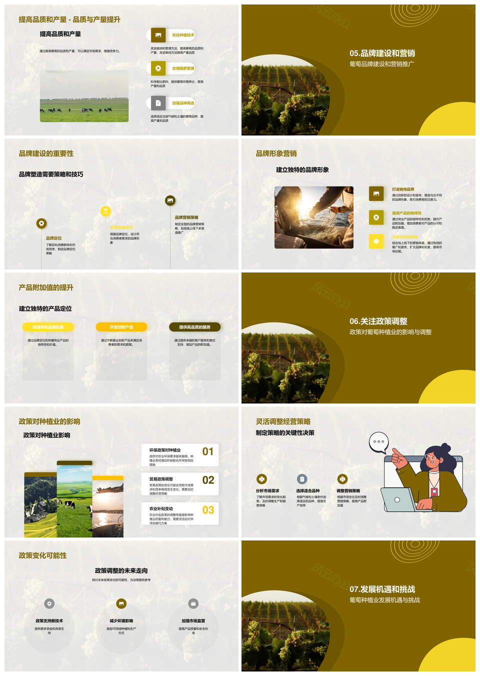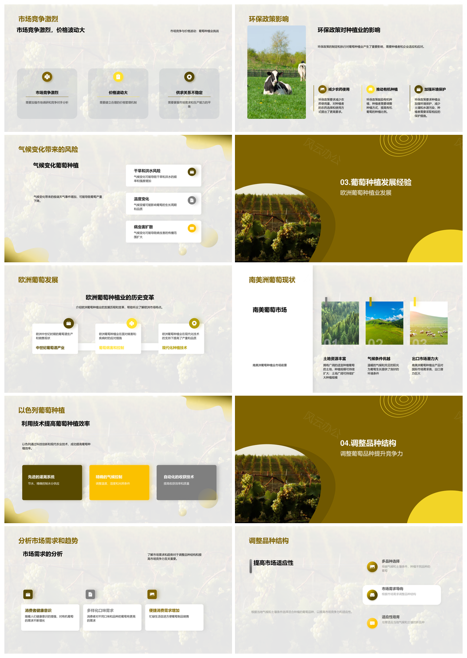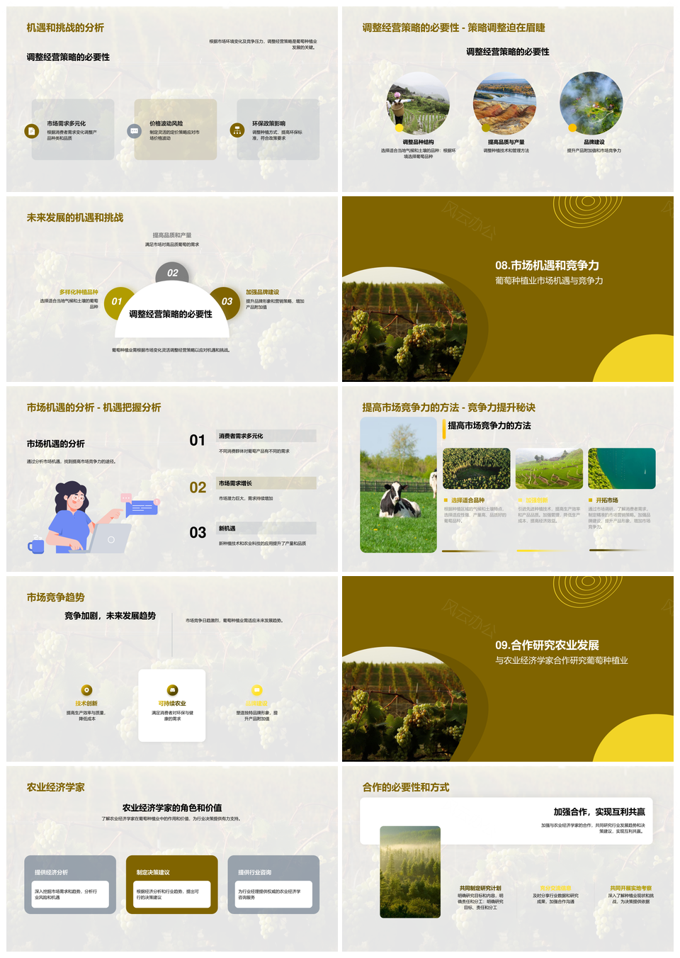 风云办公提供的全球中国葡萄种植业机遇挑战需求PPT模板,下载格式为pptx,一共39页,作品中文字及图均可以修改和编辑,图片更改请在作品中右键图片并更换,文字修改请直接点击文字进行修改。