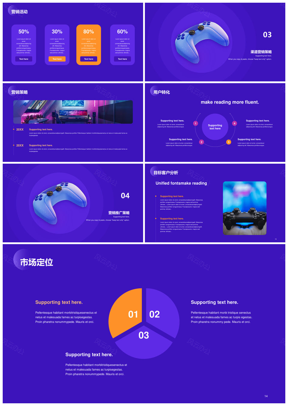 风云办公提供的紫色电子科技游戏机营销汇报PPT模板,下载格式为pptx,一共15页,作品中文字及图均可以修改和编辑,图片更改请在作品中右键图片并更换,文字修改请直接点击文字进行修改。
