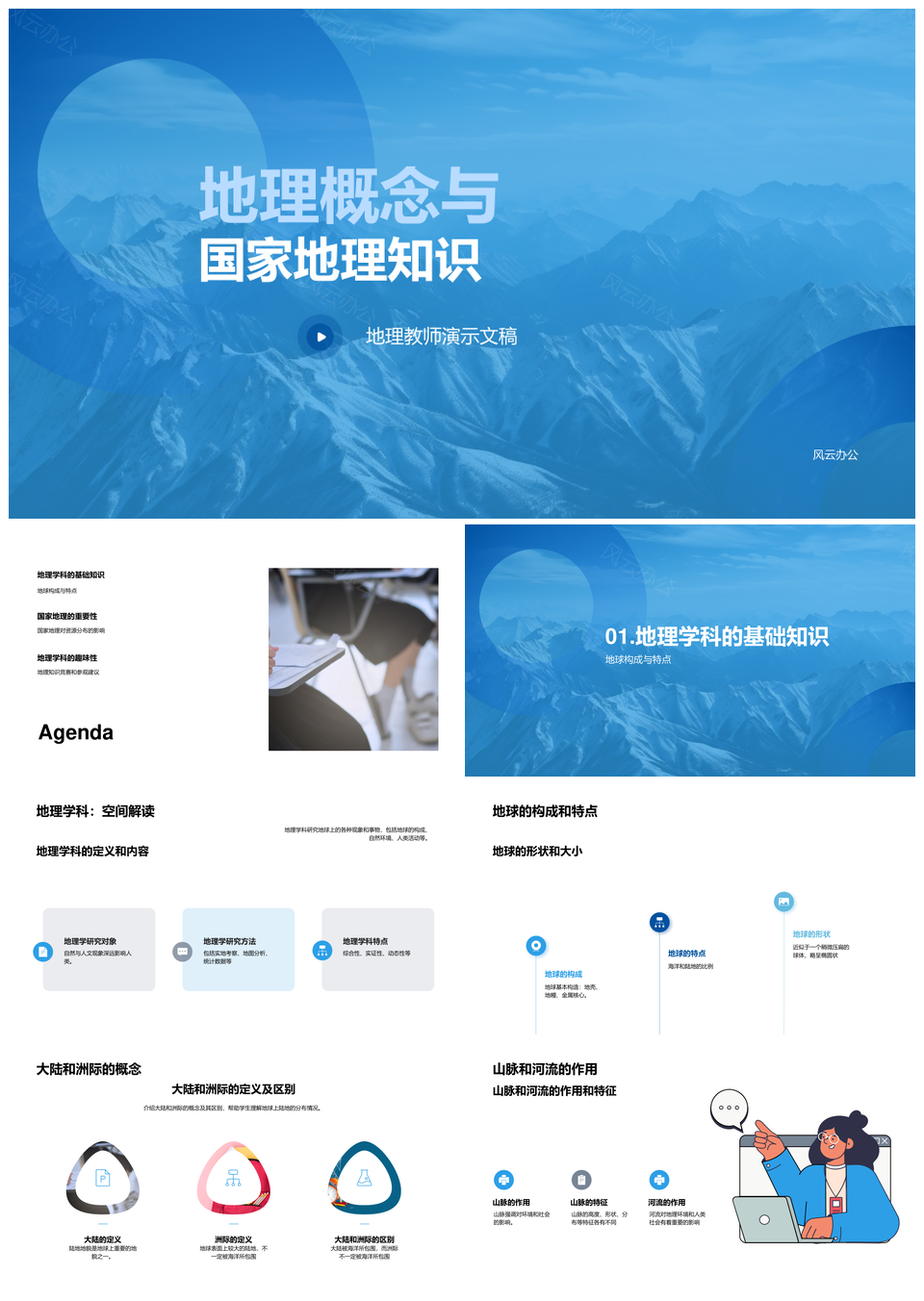 这是一张地理学科定义地球构成大陆洲际山脉特点PPT模板,包含地理学科、定义、地球、构成、大陆、洲际、山脉、特点等主题内容,也可用作地理学科定义地球构成、地球构成大陆洲际山脉、大陆洲际山脉特点、地理学科定义地球、定义地球构成、地球构成大陆、大陆洲际山脉、洲际山脉特点、地理学科定义、地球构成、大陆洲际、洲际山脉、山脉特点、定义地球、地理学科地球构成等PPT场景使用。 风云办公提供的地理学科定义地球构成大陆洲际山脉特点PPT模板,下载格式为pptx,一共16页,作品中文字及图均可以修改和编辑,图片更改请在作品中右键图片并更换,文字修改请直接点击文字进行修改。