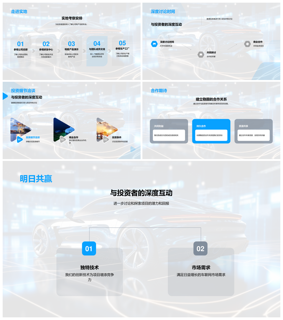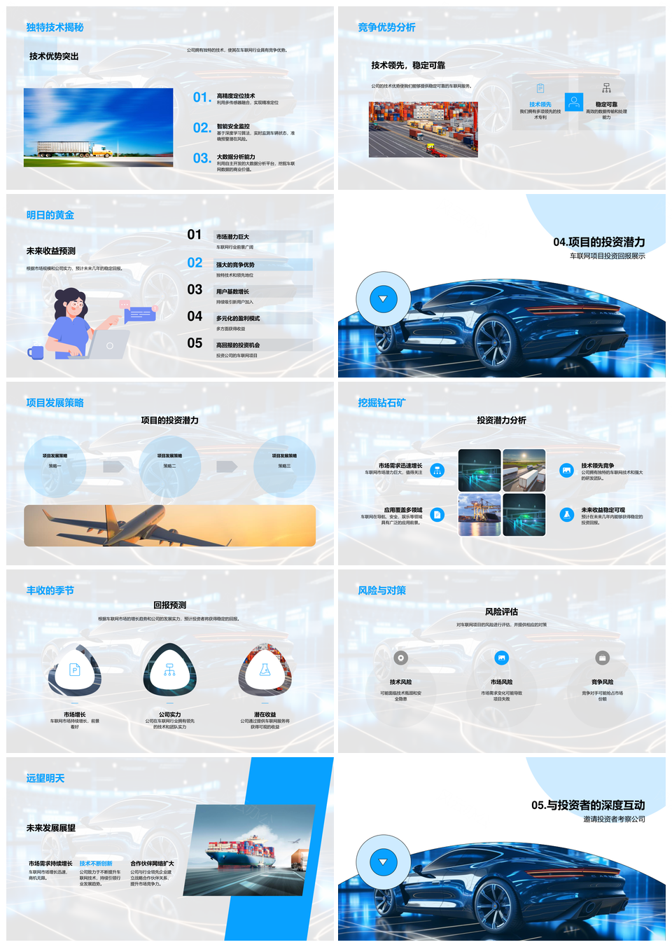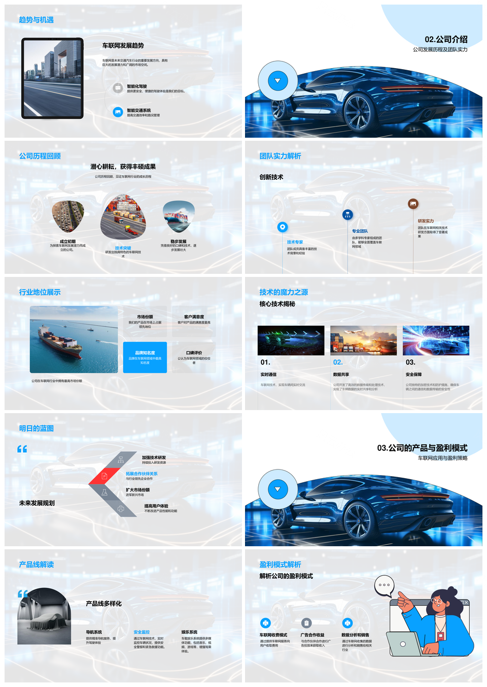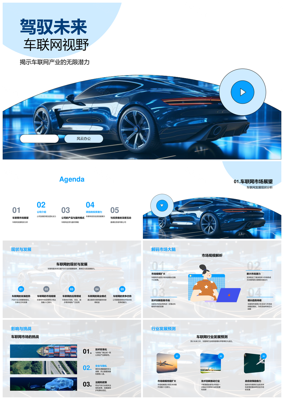风云办公提供的车联网创投未来汽车技术盈利趋势PPT模板,下载格式为pptx,一共33页,作品中文字及图均可以修改和编辑,图片更改请在作品中右键图片并更换,文字修改请直接点击文字进行修改。