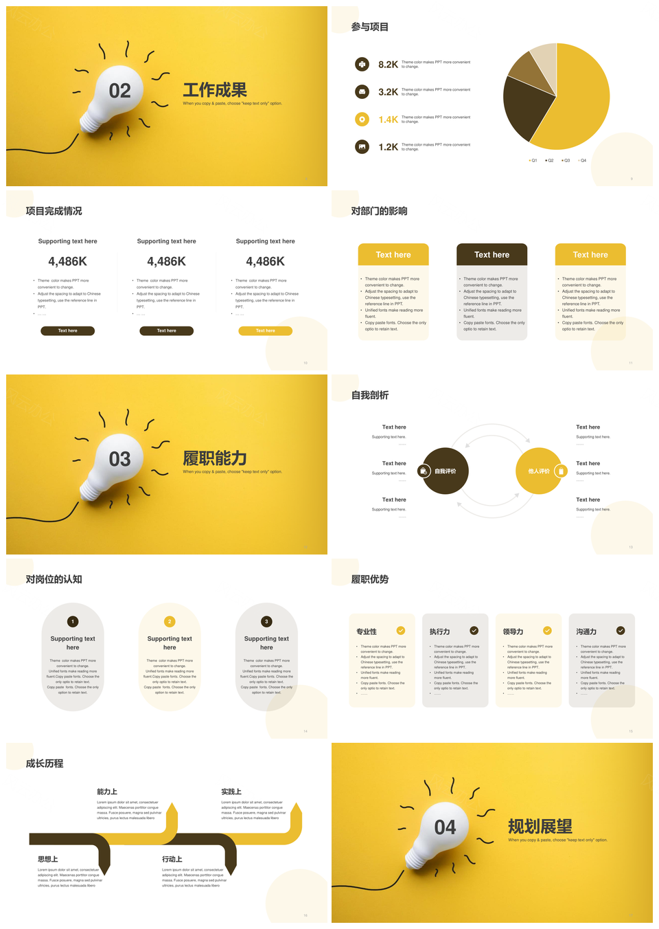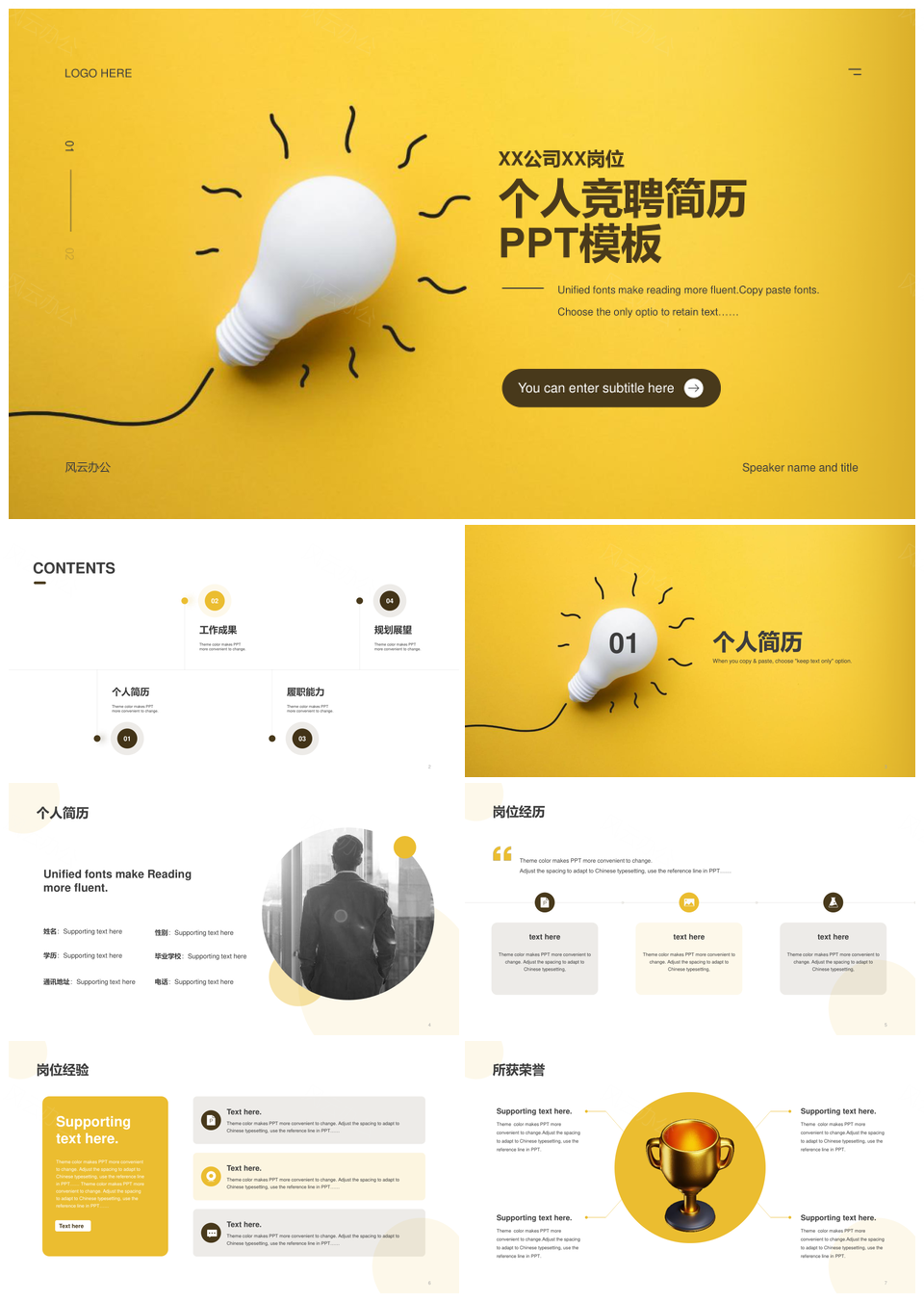 风云办公提供的黄色创意灵感思维竞聘述职汇报PPT模板,下载格式为pptx,一共22页,作品中文字及图均可以修改和编辑,图片更改请在作品中右键图片并更换,文字修改请直接点击文字进行修改。
