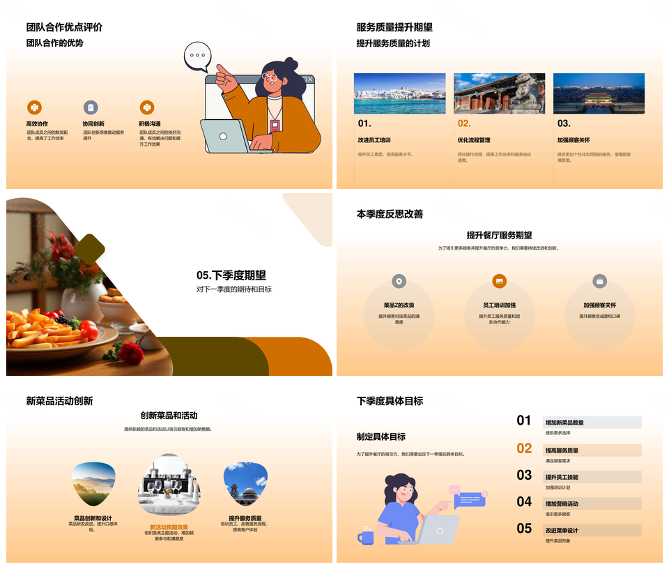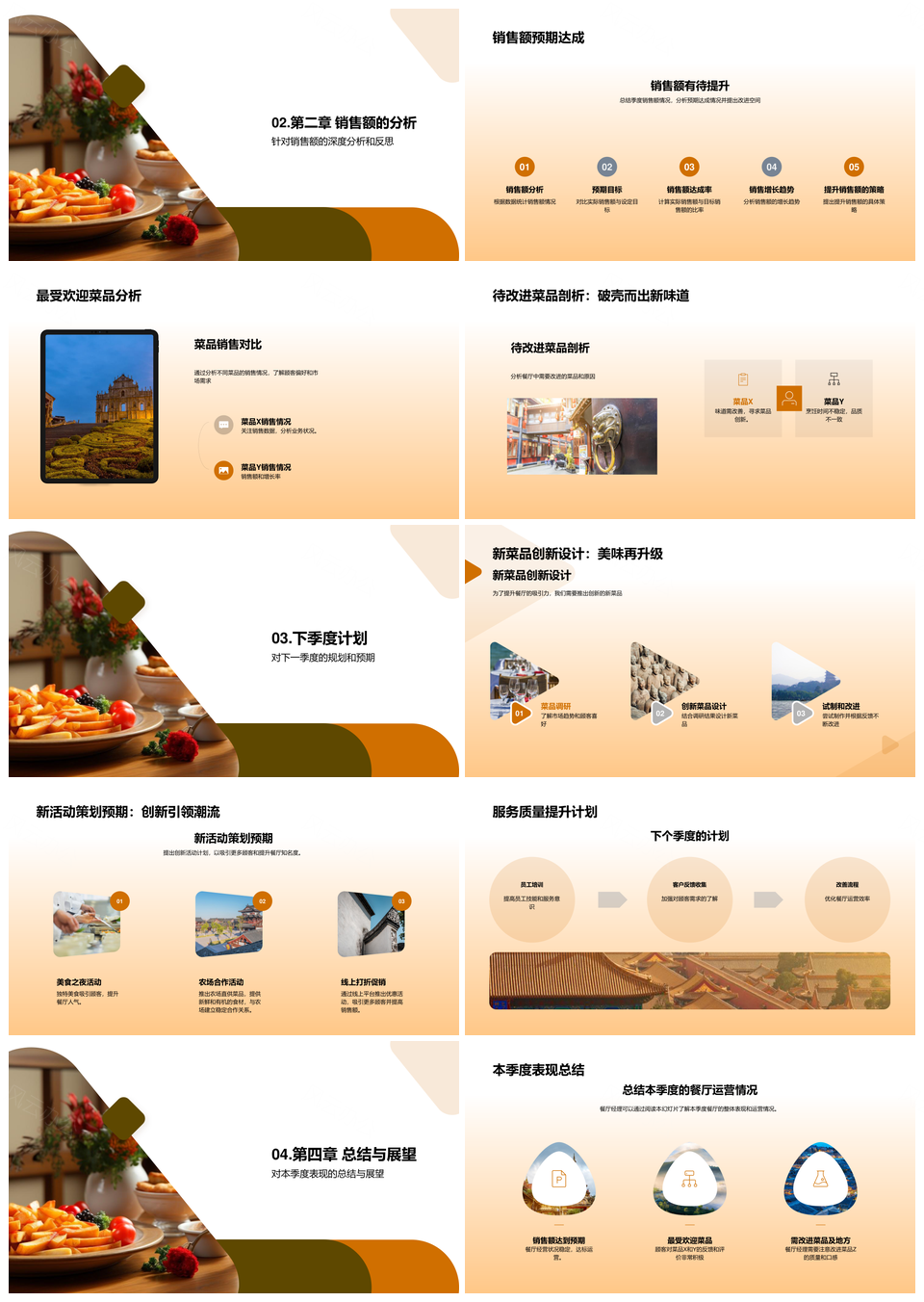 这是一张季度餐饮业绩总览销售顾客反馈新品市场团队服务活动饼图PPT模板,包含季度、餐饮、业绩、总览、销售、顾客、反馈、新品、市场、团队、服务、活动、饼图等主题内容,也可用作季度餐饮业绩总览、餐饮业绩总览销售、销售顾客反馈新品、顾客反馈新品市场、新品市场团队服务、市场团队服务活动、季度餐饮业绩、餐饮业绩总览、销售顾客反馈、顾客反馈新品、市场团队服务、团队服务活动、季度餐饮、餐饮业绩、顾客反馈等PPT场景使用。 风云办公提供的季度餐饮业绩总览销售顾客反馈新品市场团队服务活动饼图PPT模板,下载格式为pptx,一共24页,作品中文字及图均可以修改和编辑,图片更改请在作品中右键图片并更换,文字修改请直接点击文字进行修改。