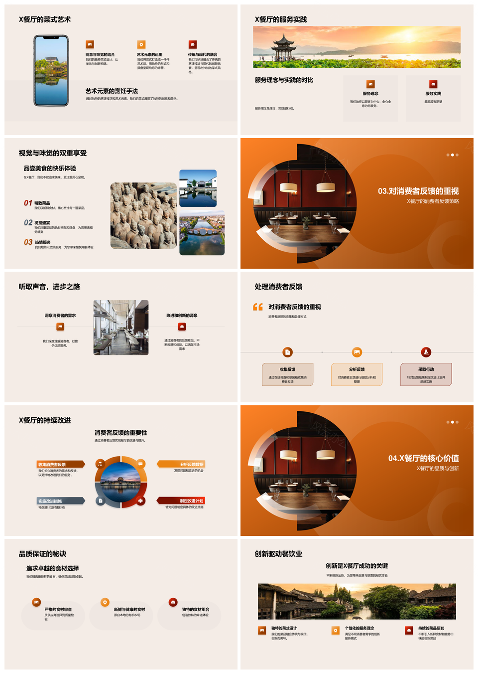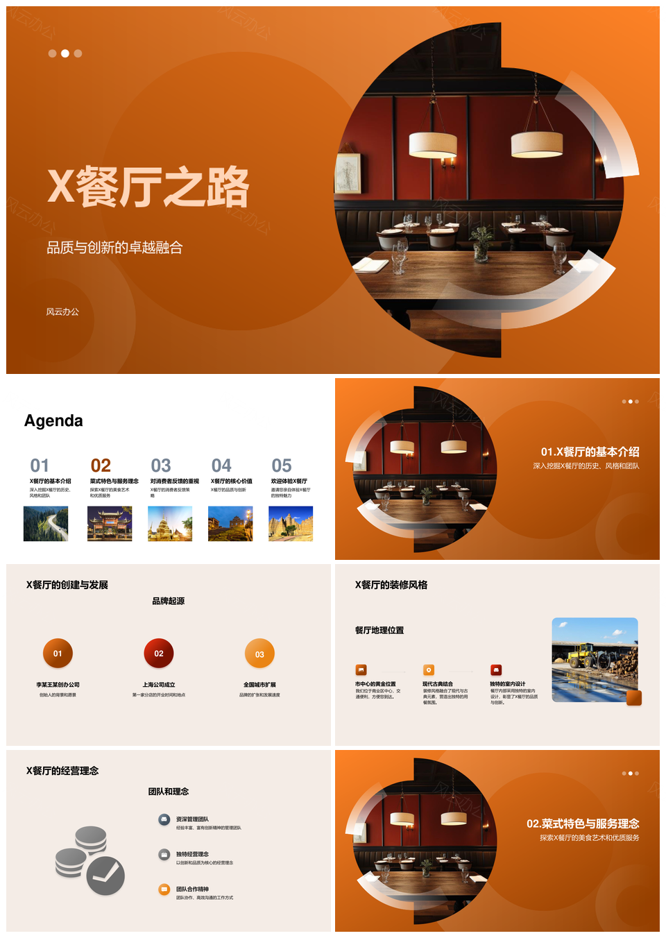 风云办公提供的X餐厅品质创新艺术服务团队风格之路PPT模板,下载格式为pptx,一共23页,作品中文字及图均可以修改和编辑,图片更改请在作品中右键图片并更换,文字修改请直接点击文字进行修改。