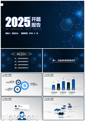 这是一张2025可编辑蓝色科技感开题PPT模板,包含蓝色、高分、科技感、答辩、开题报告等主题内容,也可用作蓝色高分科技感答辩、高分科技感答辩开题、科技感答辩开题报告、蓝色高分科技感、高分科技感答辩、科技感答辩开题、答辩开题报告、蓝色高分、高分科技感、科技感答辩、答辩开题、开题报告等PPT场景使用。 风云办公提供的2025可编辑蓝色科技感开题PPT模板,下载格式为pptx,一共30页,作品中文字及图均可以修改和编辑,图片更改请在作品中右键图片并更换,文字修改请直接点击文字进行修改。