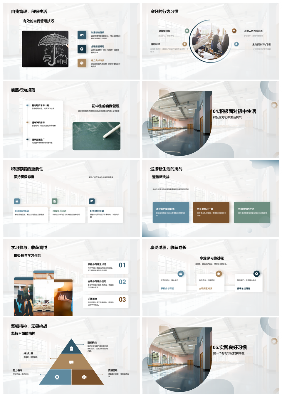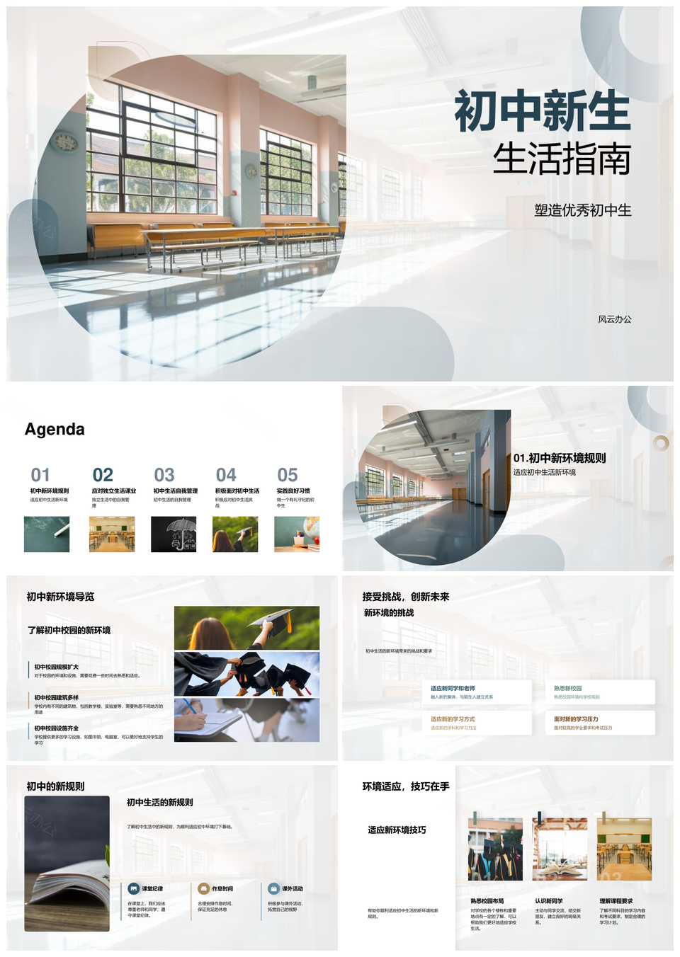 风云办公提供的初中新生适应管理与优秀习惯养成指南PPT模板,下载格式为pptx,一共33页,作品中文字及图均可以修改和编辑,图片更改请在作品中右键图片并更换,文字修改请直接点击文字进行修改。