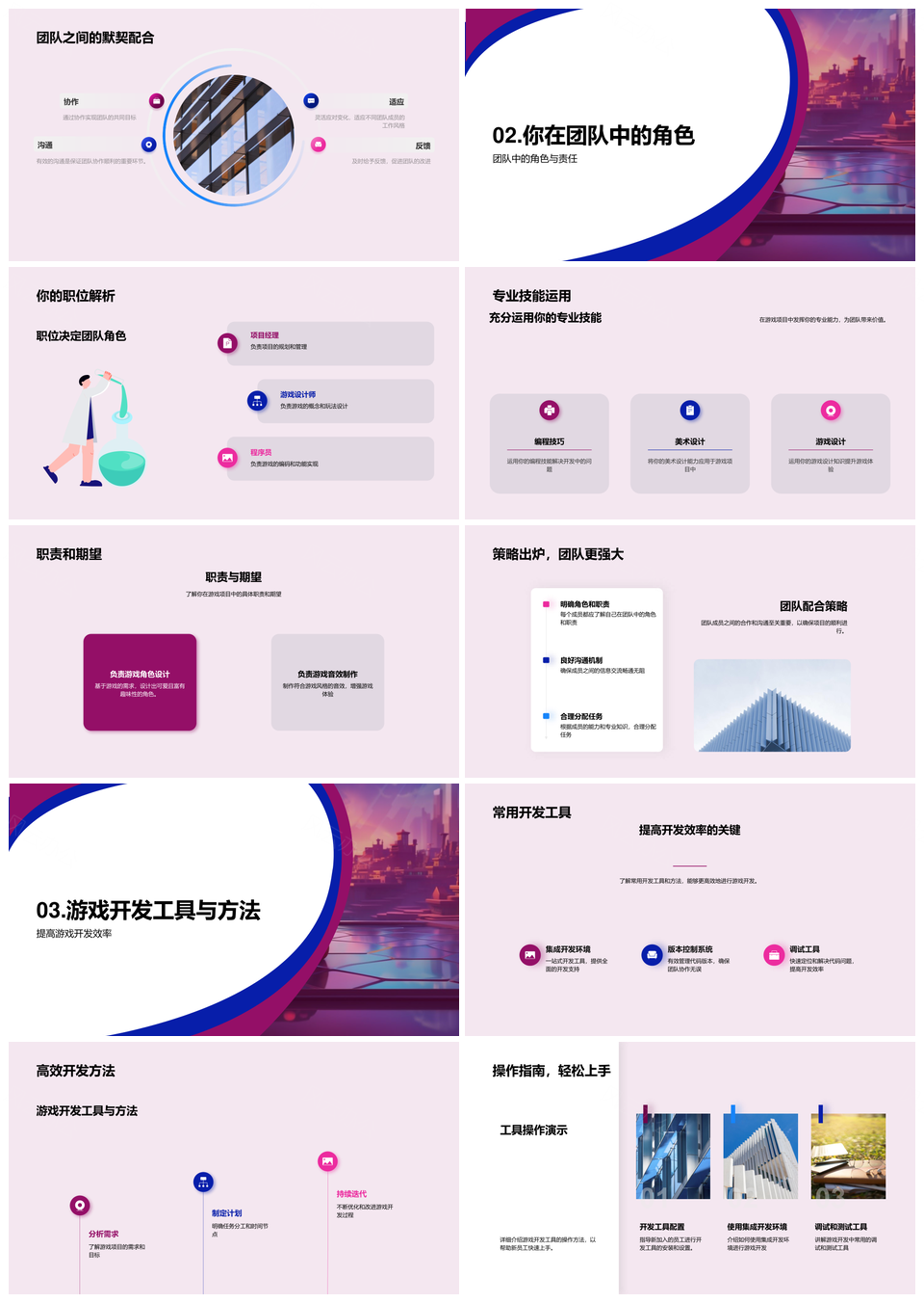 这是一张游戏开发新手团队协作职责工具方法培训PPT模板,包含游戏开发、新手、团队、协作、职责、工具、方法、培训等主题内容,也可用作游戏开发新手团队协作职责、团队协作职责工具方法、职责工具方法培训、游戏开发新手团队协作、新手团队协作职责、团队协作职责工具、职责工具方法、工具方法培训、游戏开发团队协作工具、团队协作工具方法、游戏开发工具方法、游戏开发新手培训、游戏开发新手、新手团队协作、团队协作职责等PPT场景使用。 风云办公提供的游戏开发新手团队协作职责工具方法培训PPT模板,下载格式为pptx,一共30页,作品中文字及图均可以修改和编辑,图片更改请在作品中右键图片并更换,文字修改请直接点击文字进行修改。