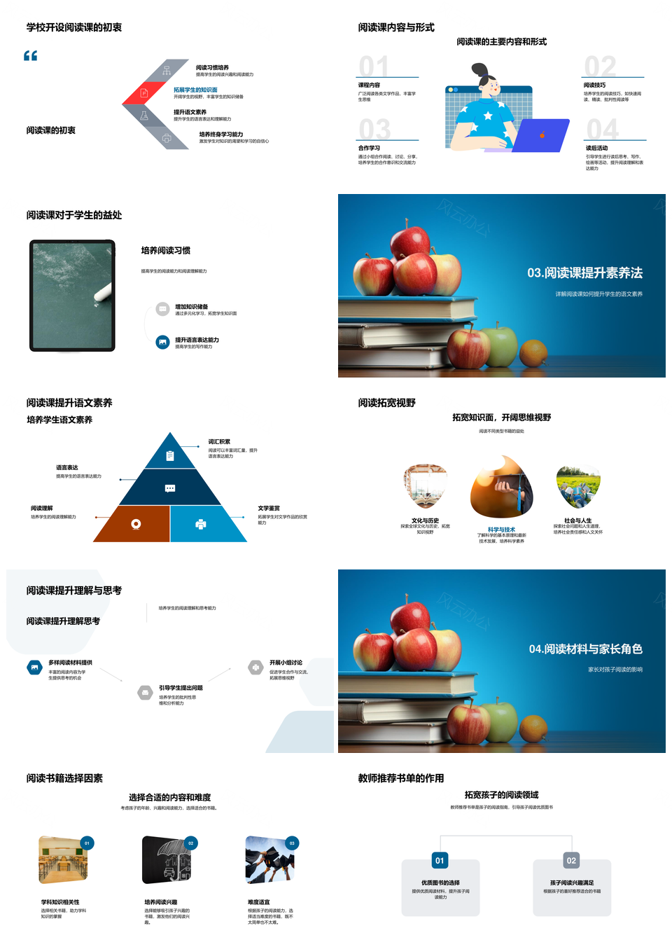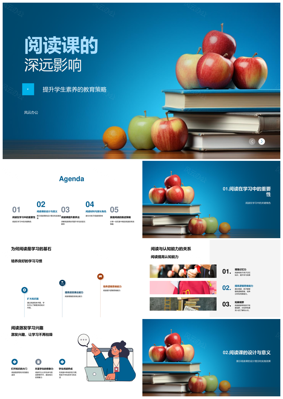 风云办公提供的阅读课育素养启智趣促习惯PPT模板,下载格式为pptx,一共24页,作品中文字及图均可以修改和编辑,图片更改请在作品中右键图片并更换,文字修改请直接点击文字进行修改。