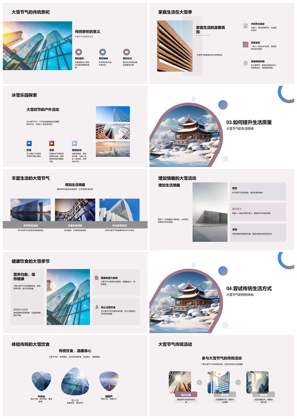 风云办公提供的大雪节气传统食俗祭祀踏雪赏景PPT模板,下载格式为pptx,一共23页,作品中文字及图均可以修改和编辑,图片更改请在作品中右键图片并更换,文字修改请直接点击文字进行修改。