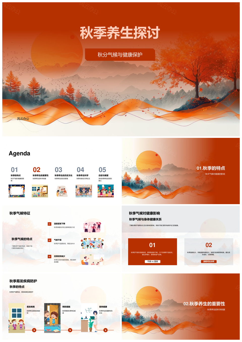 风云办公提供的秋分养生科学防病饮食保健PPT模板,下载格式为pptx,一共23页,作品中文字及图均可以修改和编辑,图片更改请在作品中右键图片并更换,文字修改请直接点击文字进行修改。
