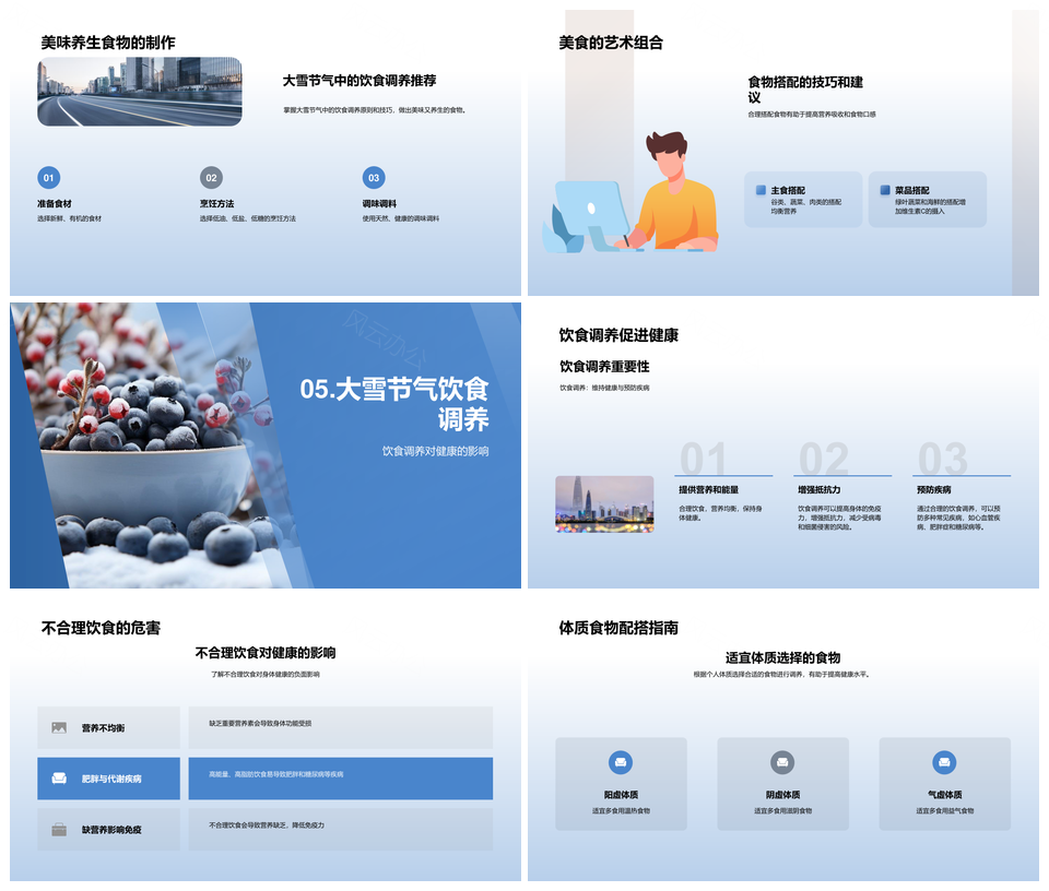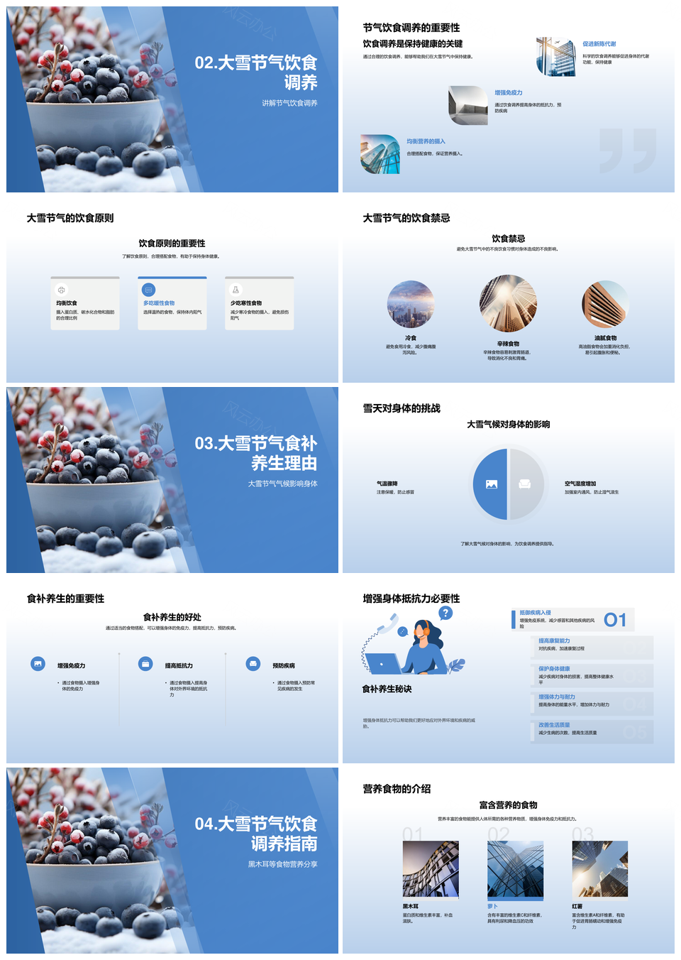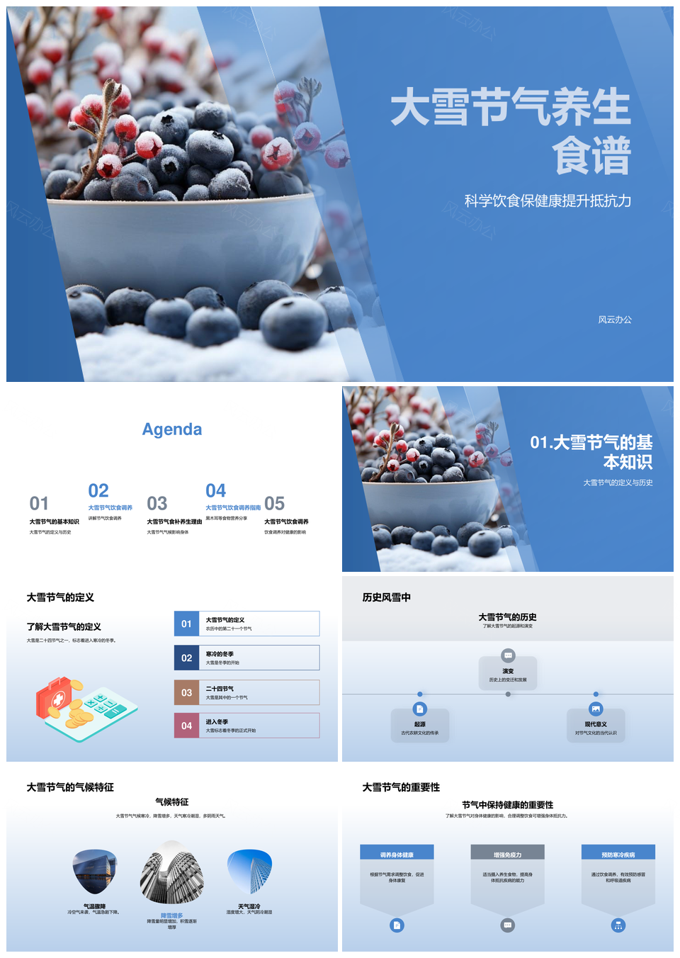 风云办公提供的大雪节气御寒食补养生食谱增强抵抗力PPT模板,下载格式为pptx,一共24页,作品中文字及图均可以修改和编辑,图片更改请在作品中右键图片并更换,文字修改请直接点击文字进行修改。