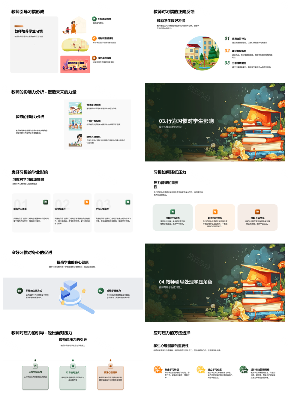 这是一张良好习惯助力学业成功师教引领学长示范减压PPT模板,包含良好习惯、学业成功、师教引领、学长示范、减压等主题内容,也可用作良好习惯助力学业成功、师教引领学长示范、良好习惯助力学业、助力学业成功、学业成功师教、师教引领学长、学长示范减压、良好习惯助力、助力学业、学业成功、成功师教、师教引领、引领学长、学长示范、示范减压等PPT场景使用。 风云办公提供的良好习惯助力学业成功师教引领学长示范减压PPT模板,下载格式为pptx,一共23页,作品中文字及图均可以修改和编辑,图片更改请在作品中右键图片并更换,文字修改请直接点击文字进行修改。