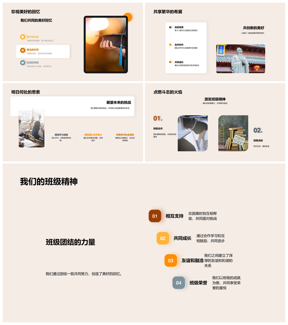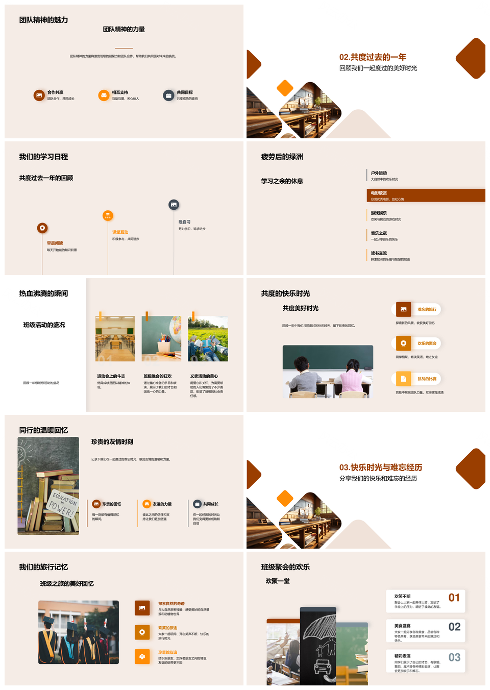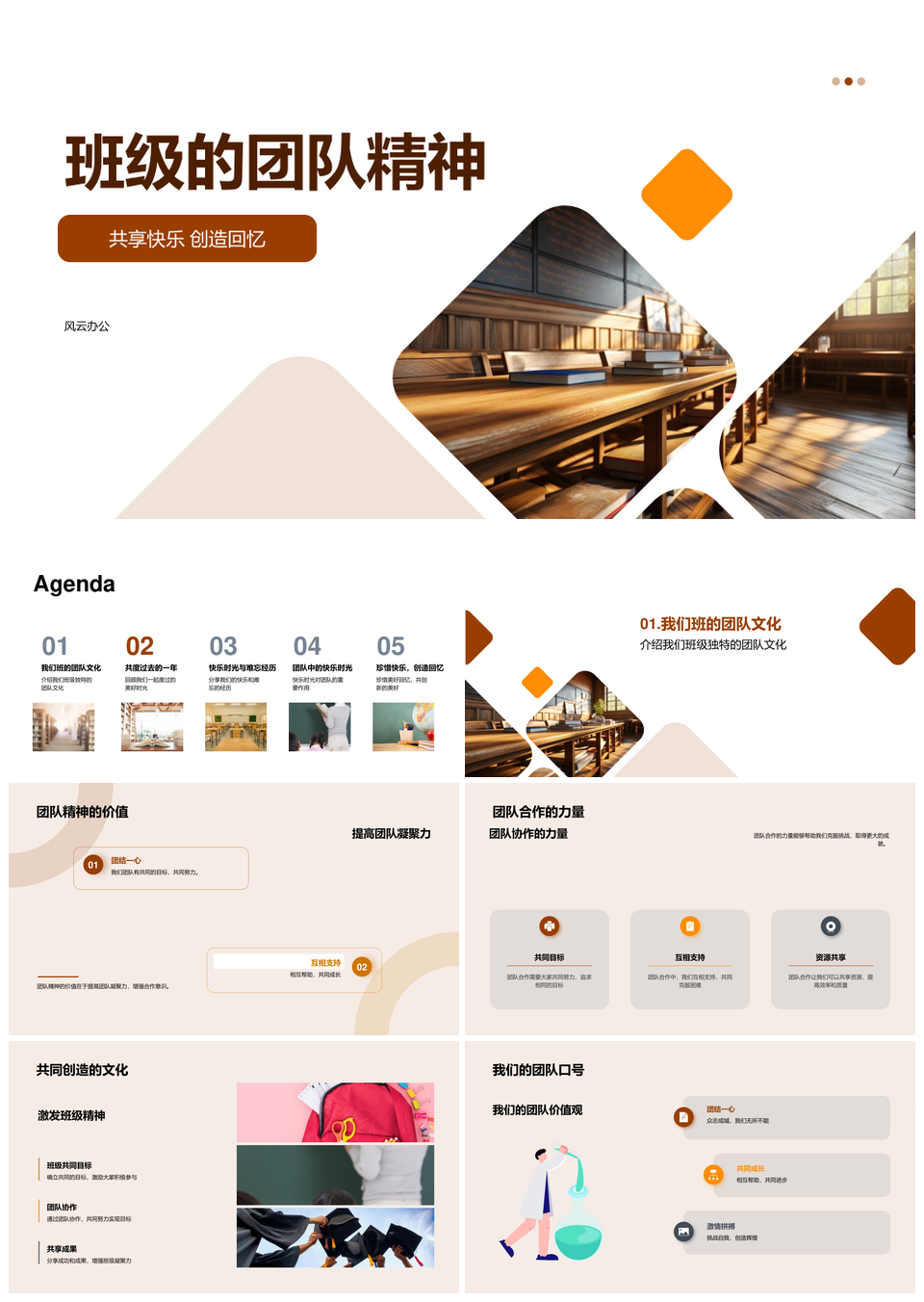 风云办公提供的班级团队精神共享快乐创造回忆PPT模板,下载格式为pptx,一共33页,作品中文字及图均可以修改和编辑,图片更改请在作品中右键图片并更换,文字修改请直接点击文字进行修改。