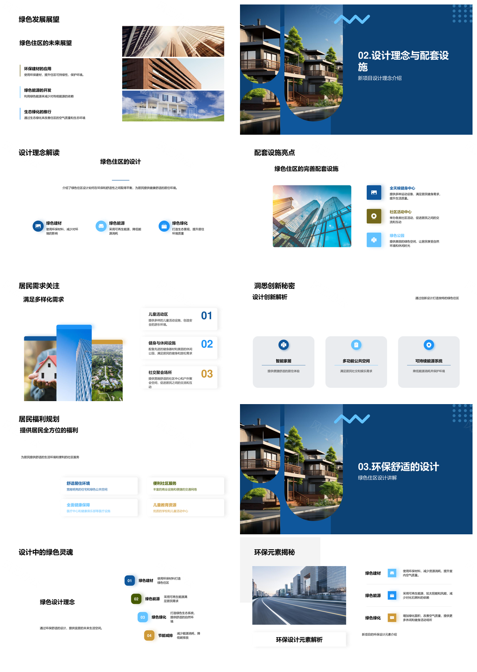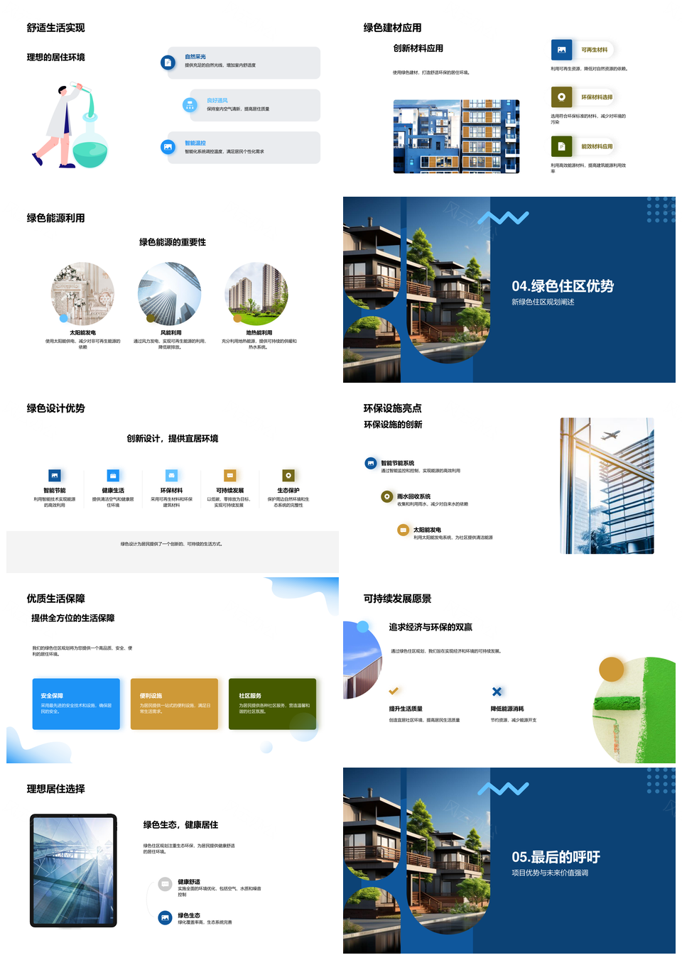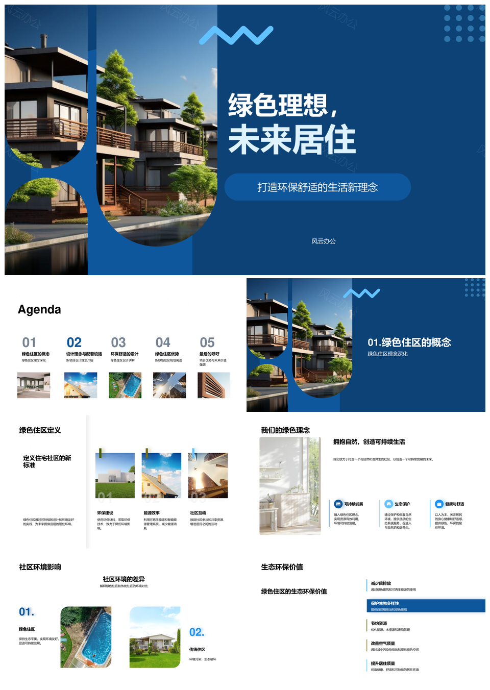 风云办公提供的绿色住区环保设计可持续能源新生活PPT模板,下载格式为pptx,一共33页,作品中文字及图均可以修改和编辑,图片更改请在作品中右键图片并更换,文字修改请直接点击文字进行修改。