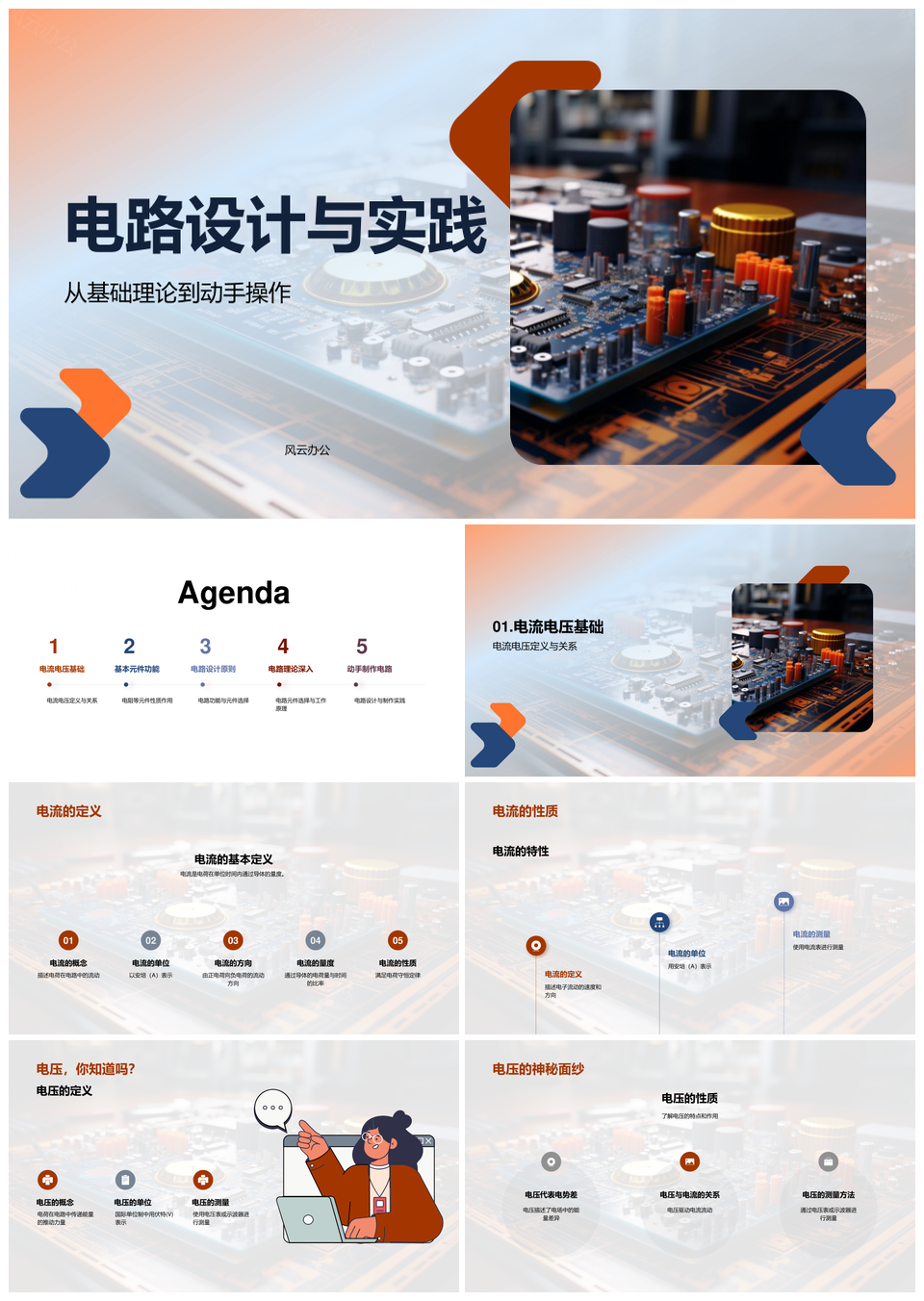 风云办公提供的电路设计实践电流电压元件电路板应用PPT模板,下载格式为pptx,一共29页,作品中文字及图均可以修改和编辑,图片更改请在作品中右键图片并更换,文字修改请直接点击文字进行修改。