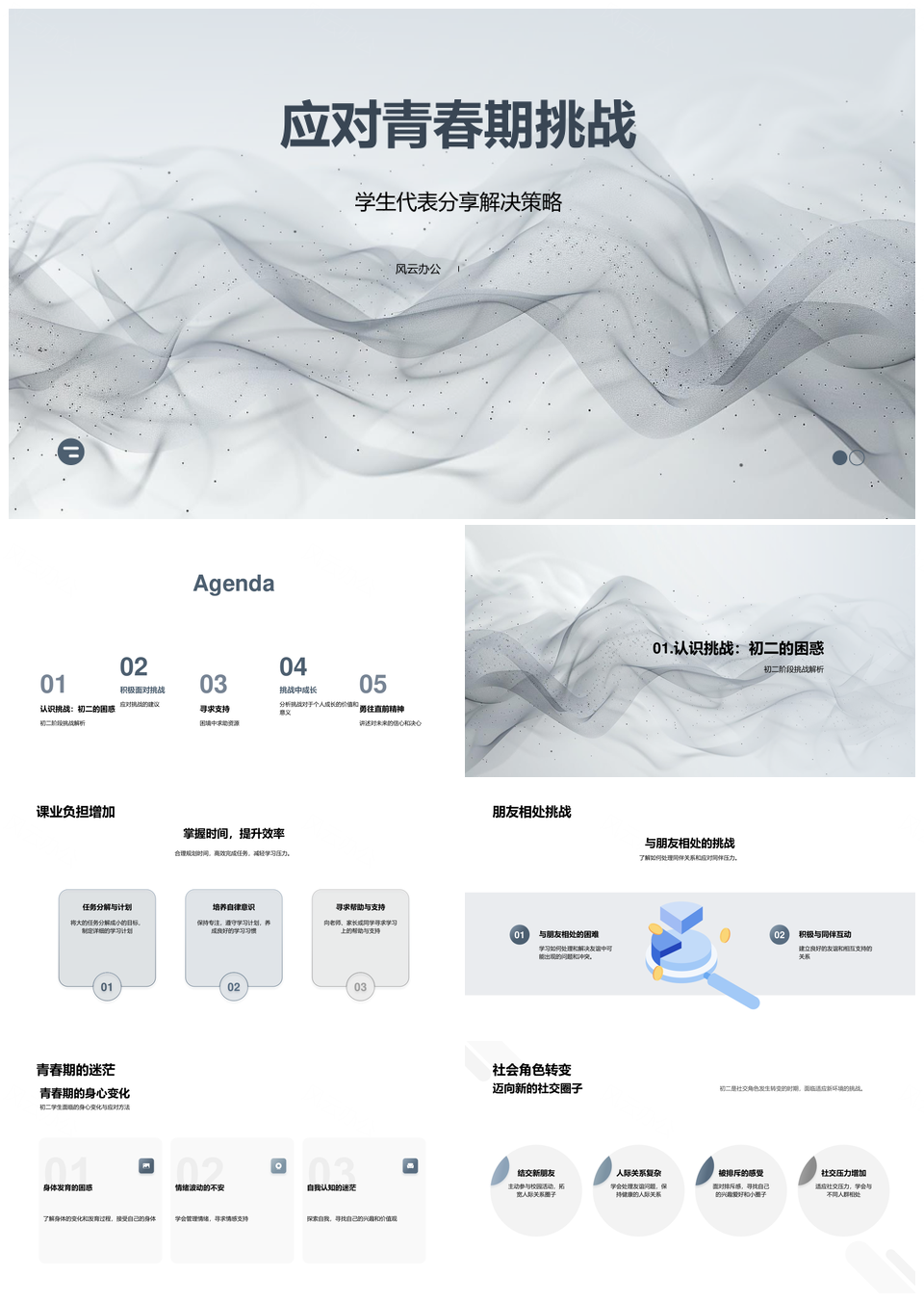 风云办公提供的学生代表应对青春期挑战策略教育安全PPT模板,下载格式为pptx,一共33页,作品中文字及图均可以修改和编辑,图片更改请在作品中右键图片并更换,文字修改请直接点击文字进行修改。
