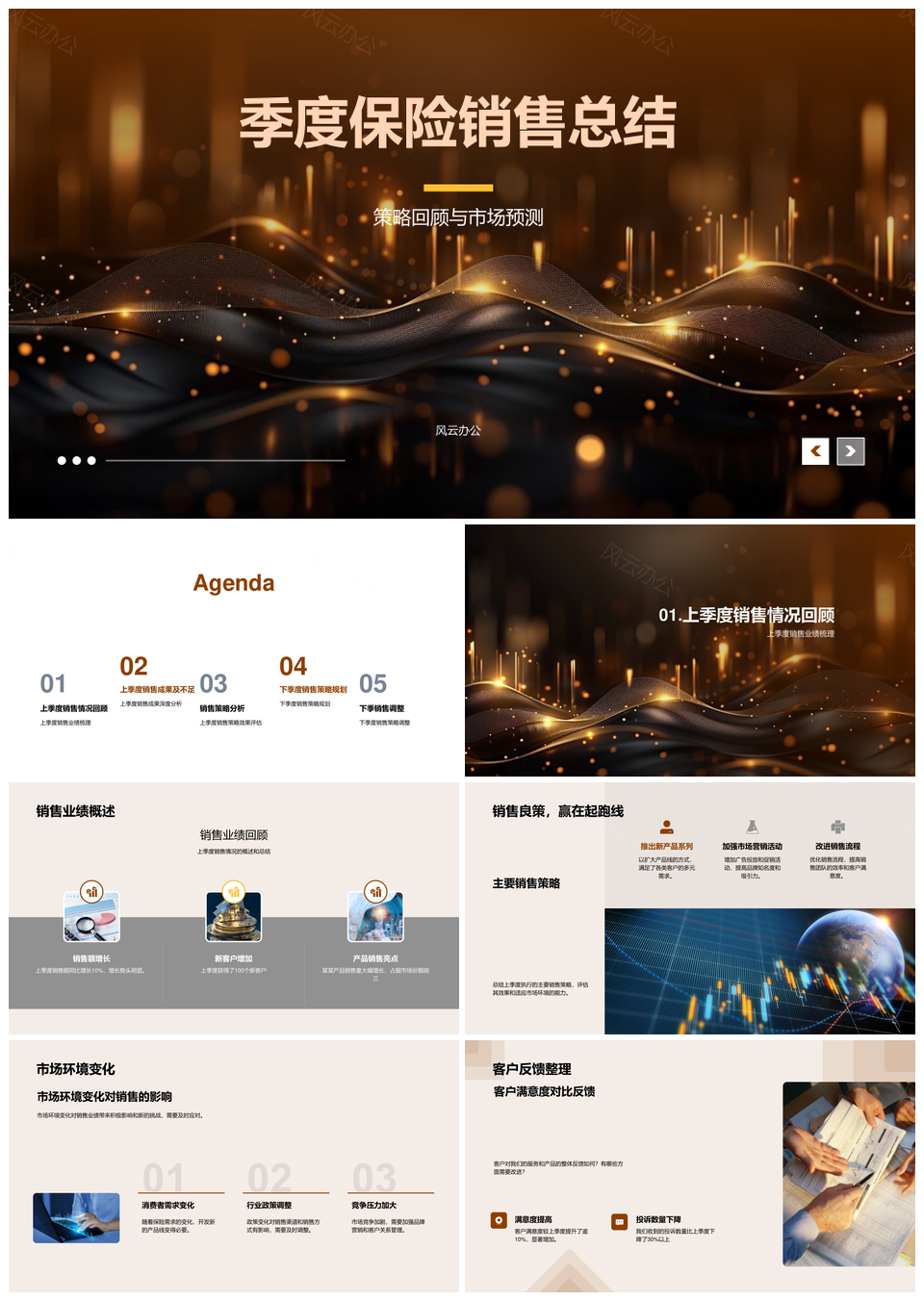 风云办公提供的保险销售季度总结策略调整及市场预测PPT模板,下载格式为pptx,一共33页,作品中文字及图均可以修改和编辑,图片更改请在作品中右键图片并更换,文字修改请直接点击文字进行修改。