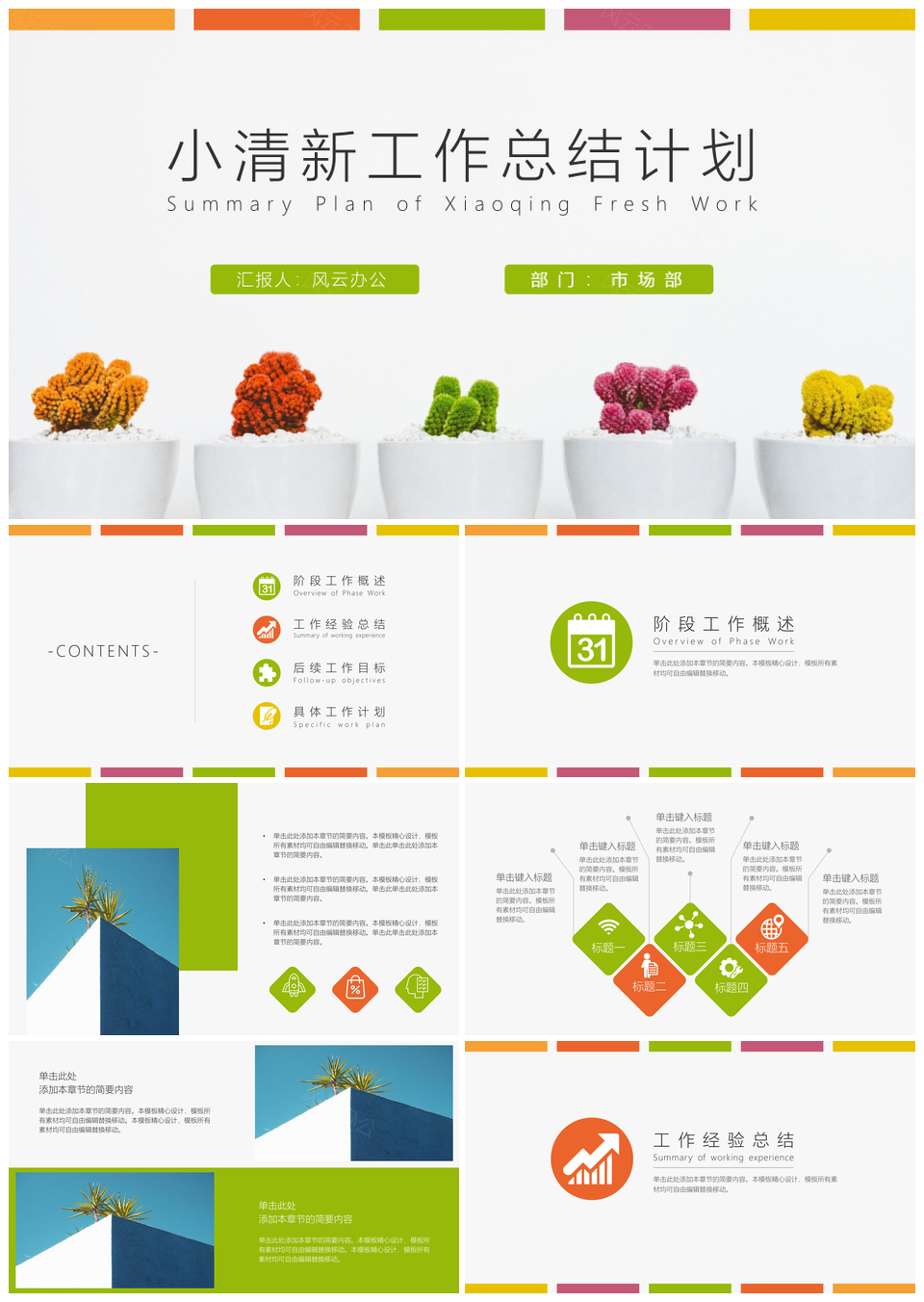 风云办公提供的述职报告彩色小清新工作总结计划PPT模板,下载格式为pptx,一共19页,作品中文字及图均可以修改和编辑,图片更改请在作品中右键图片并更换,文字修改请直接点击文字进行修改。