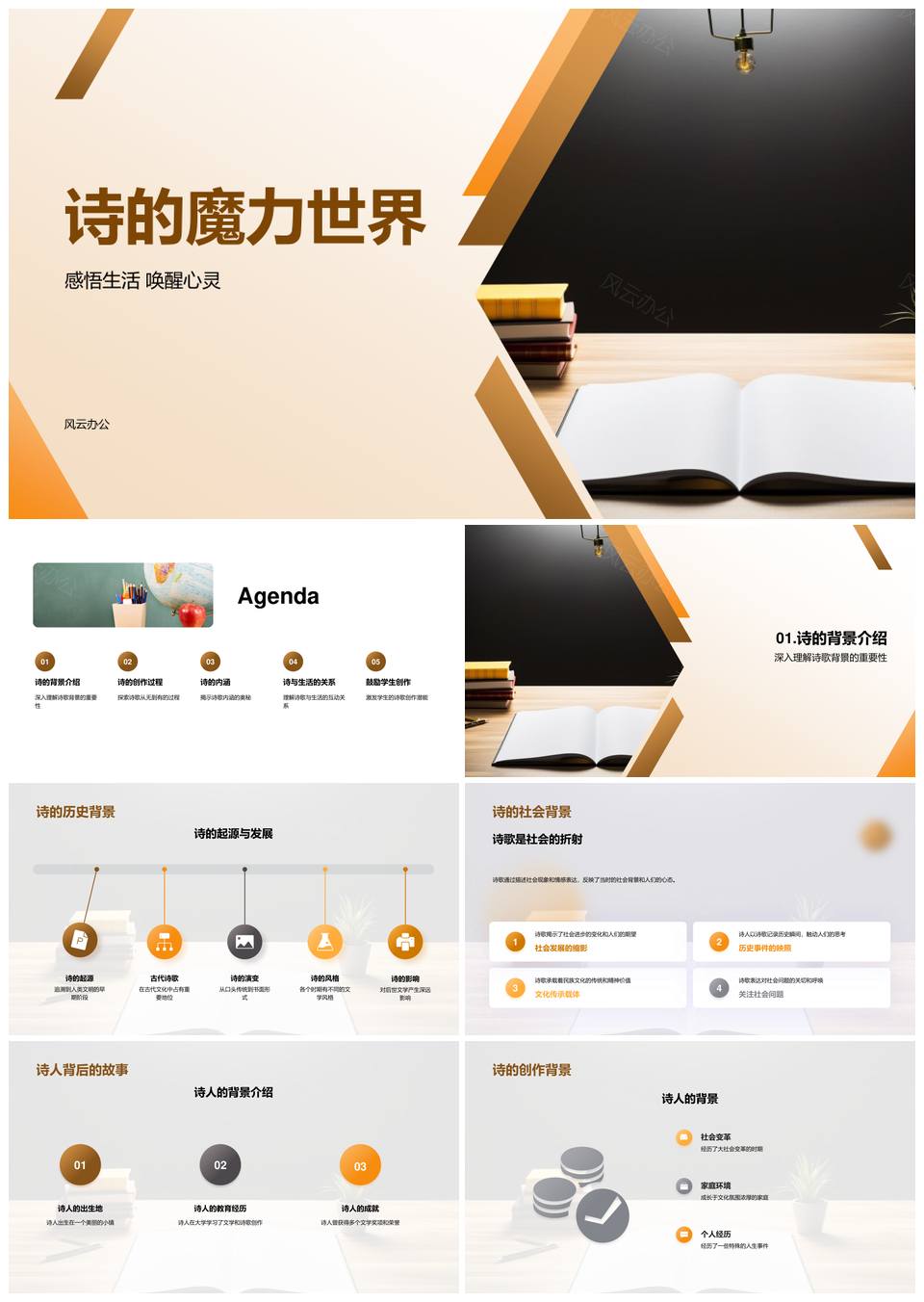 风云办公提供的诗启生活悟心创作魔力书卷PPT模板,下载格式为pptx,一共33页,作品中文字及图均可以修改和编辑,图片更改请在作品中右键图片并更换,文字修改请直接点击文字进行修改。