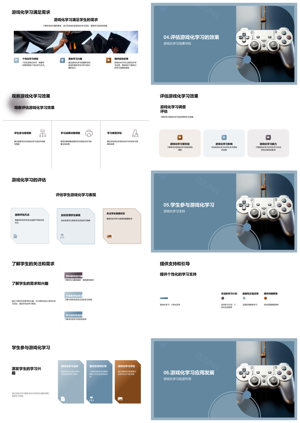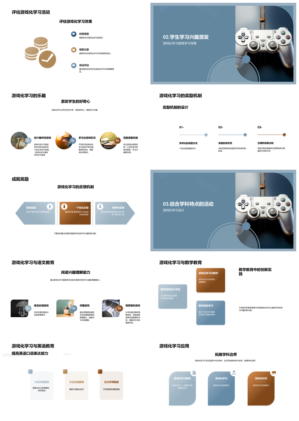 这是一张游戏化学习提升兴趣参与度教育培训师引导促进学科评估PPT模板,包含游戏化学习、提升、兴趣、参与度、教育培训师、引导、促进、学科评估等主题内容,也可用作游戏化学习提升兴趣参与度、教育培训师引导促进学科评估、游戏化学习提升兴趣、提升兴趣参与度教育、教育培训师引导促进、引导促进学科评估、游戏化学习提升参与度、学习提升兴趣参与度、提升兴趣参与度、教育培训师引导、引导促进学科、促进学科评估、游戏化学习、学科评估、引导促进等PPT场景使用。 风云办公提供的游戏化学习提升兴趣参与度教育培训师引导促进学科评估PPT模板,下载格式为pptx,一共32页,作品中文字及图均可以修改和编辑,图片更改请在作品中右键图片并更换,文字修改请直接点击文字进行修改。