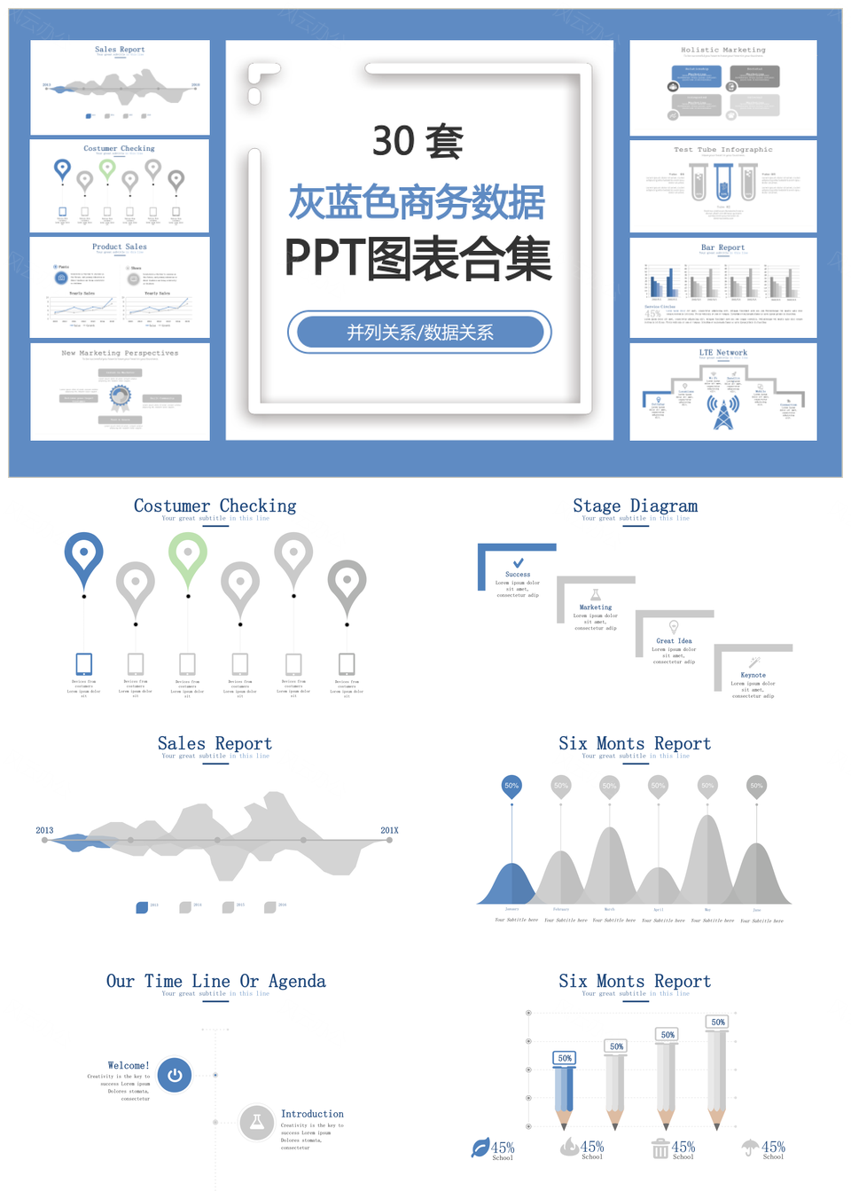 这是一张灰蓝色商务数据并列关系数据关系PPT图表合集,包含灰蓝色、商务数据、并列关系、数据关系、图表合集等主题内容,也可用作灰蓝色、商务、数据、并列关系、数据关系、PPT图表、合集
