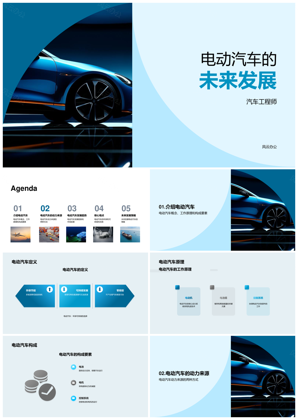 风云办公提供的电动汽车未来技术发展与市场前景PPT模板,下载格式为pptx,一共23页,作品中文字及图均可以修改和编辑,图片更改请在作品中右键图片并更换,文字修改请直接点击文字进行修改。