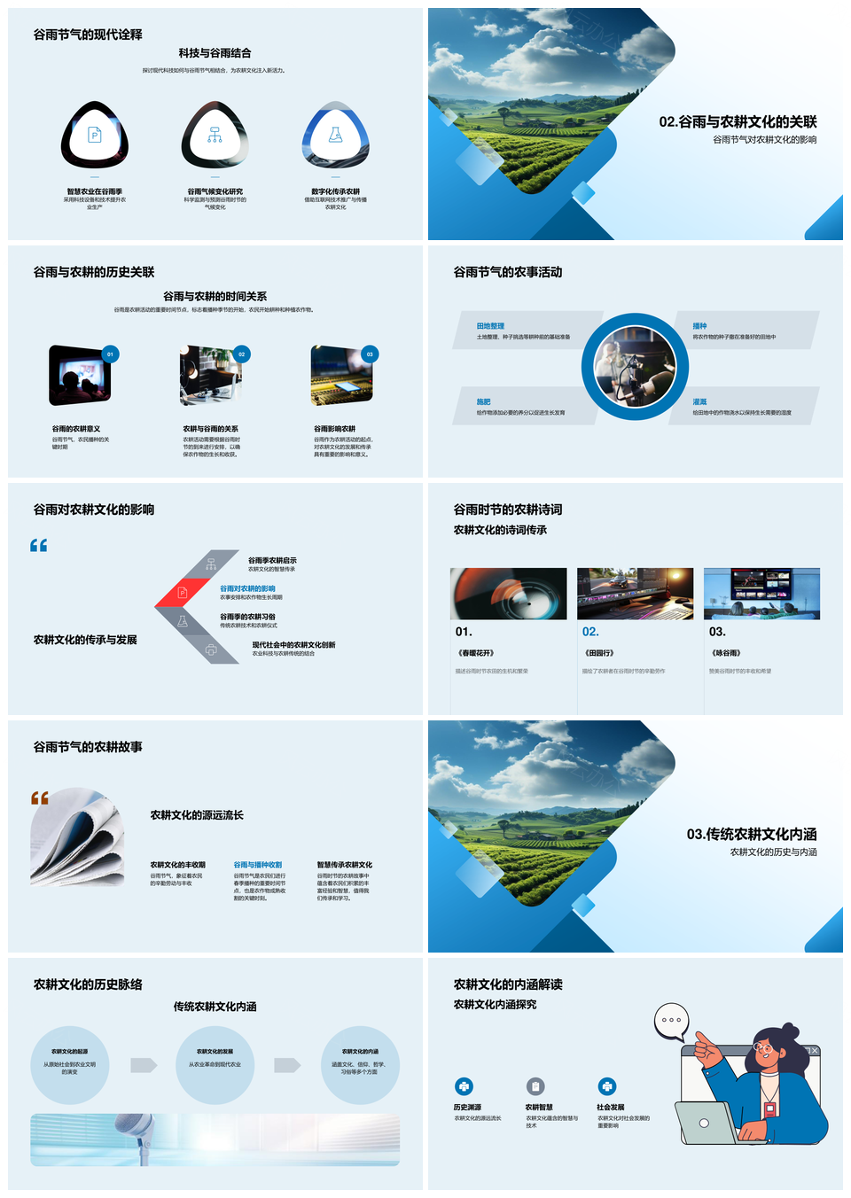 这是一张谷雨农耕文化传承发展历史社会农具媒体PPT模板,包含谷雨、农耕文化、传承、发展、历史、社会、农具、媒体等主题内容,也可用作谷雨农耕文化传承、农耕文化传承发展、文化传承发展历史、传承发展历史社会、发展历史社会农具、历史社会农具媒体、农耕文化传承、文化传承发展、传承发展历史、发展历史社会、历史社会农具、社会农具媒体、谷雨农耕、农耕文化、文化传承等PPT场景使用。 风云办公提供的谷雨农耕文化传承发展历史社会农具媒体PPT模板,下载格式为pptx,一共33页,作品中文字及图均可以修改和编辑,图片更改请在作品中右键图片并更换,文字修改请直接点击文字进行修改。