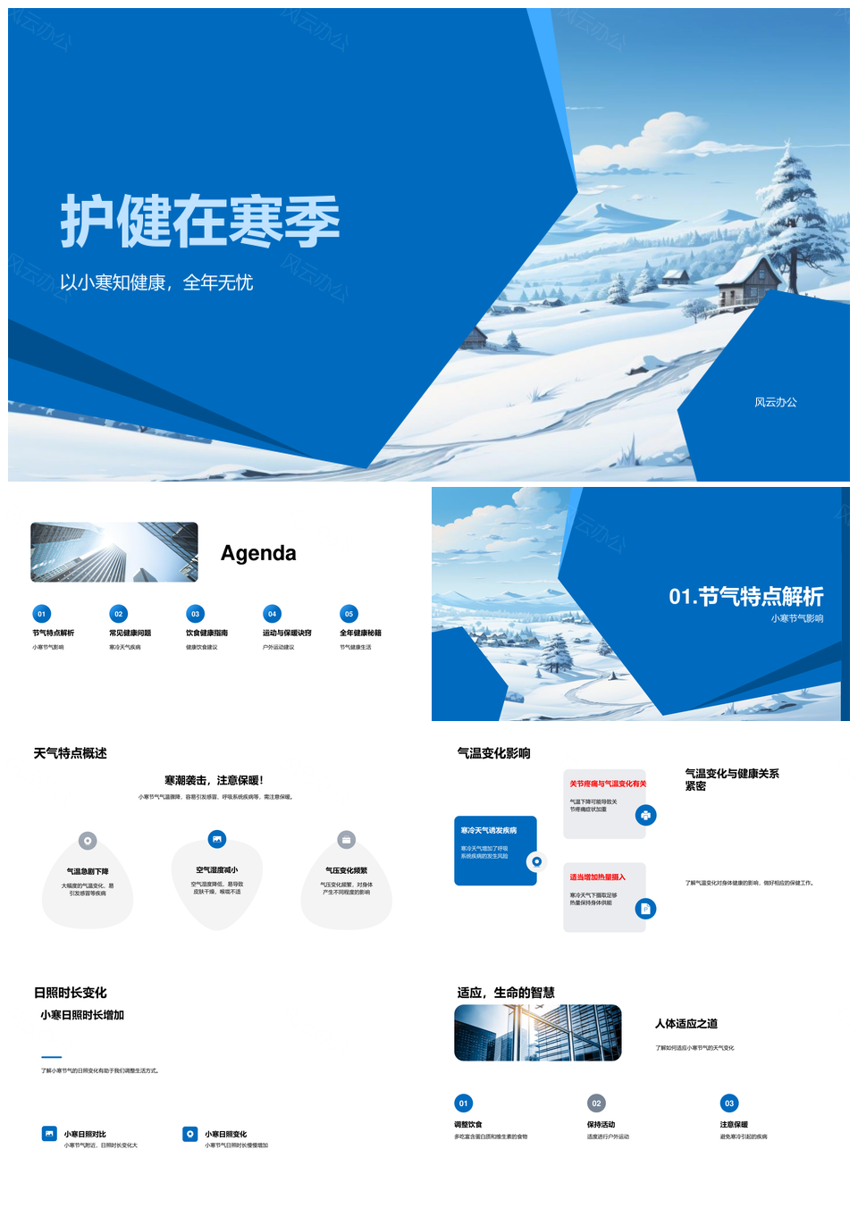 风云办公提供的小寒护健防病保暖营养指南PPT模板,下载格式为pptx,一共33页,作品中文字及图均可以修改和编辑,图片更改请在作品中右键图片并更换,文字修改请直接点击文字进行修改。