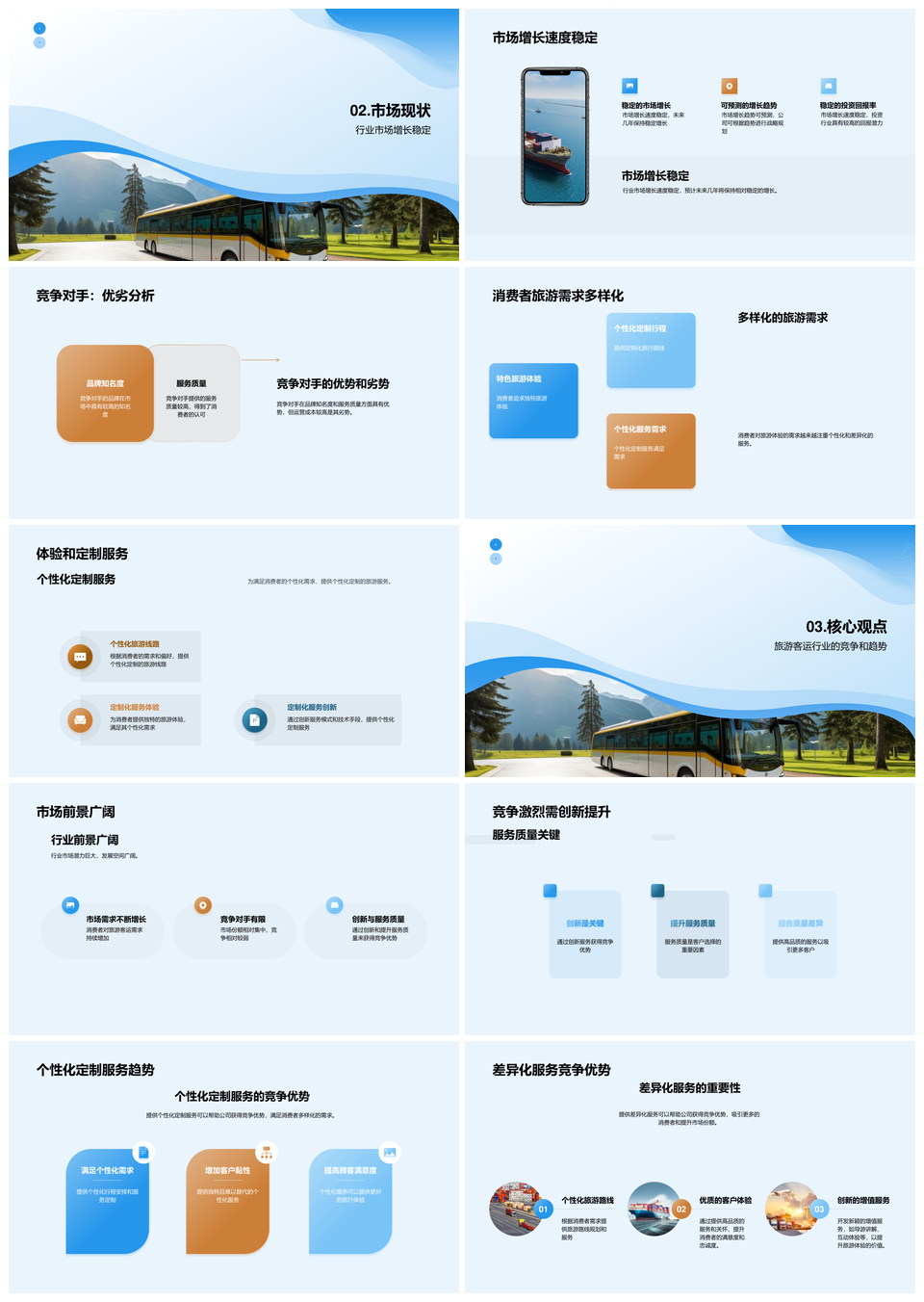 这是一张旅游客运行业现状发展趋势及市场规模分析PPT模板,包含旅游、客运、行业、现状、发展、趋势、市场、规模、分析等主题内容,也可用作旅游客运行业现状发展趋势及市场规模分析、旅游客运行业现状发展趋势、客运行业现状发展趋势分析、行业发展趋势及市场规模分析、旅游客运行业发展趋势分析、旅游客运行业市场规模分析、行业发展现状趋势市场规模、现状发展趋势市场规模分析、旅游行业发展趋势市场规模、发展趋势及市场规模分析、旅游客运行业现状分析、旅游客运市场发展趋势、客运行业市场规模分析、行业现状发展趋势分析、市场规模发展趋势分析等PPT场景使用。 风云办公提供的旅游客运行业现状发展趋势及市场规模分析PPT模板,下载格式为pptx,一共23页,作品中文字及图均可以修改和编辑,图片更改请在作品中右键图片并更换,文字修改请直接点击文字进行修改。