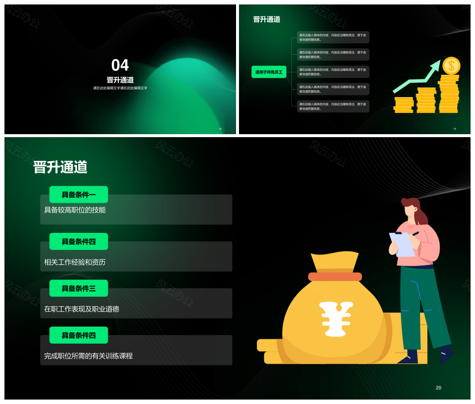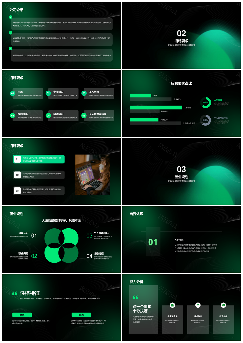 风云办公提供的绿色互联网春季招聘简约渐变PPT模板,下载格式为pptx,一共21页,作品中文字及图均可以修改和编辑,图片更改请在作品中右键图片并更换,文字修改请直接点击文字进行修改。
