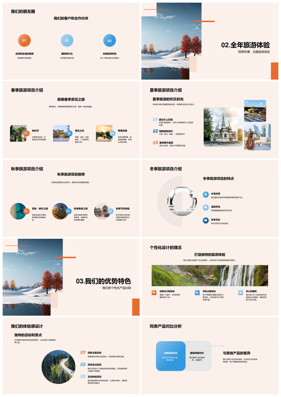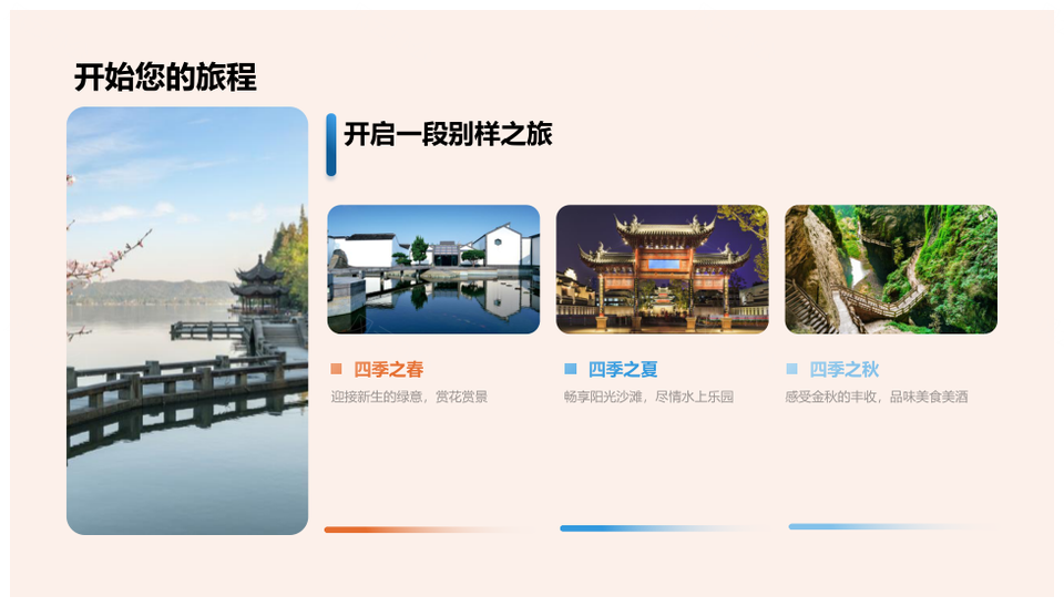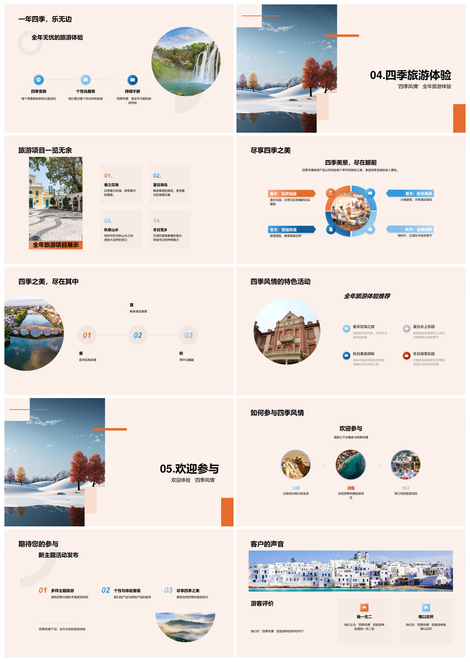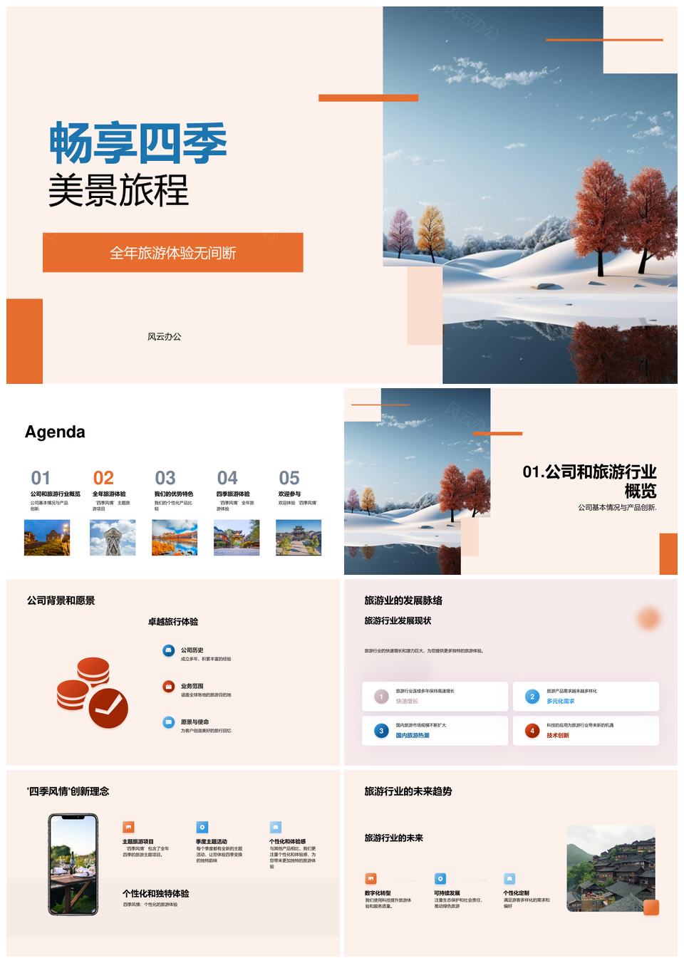 风云办公提供的四季主题旅游个性化体验设计PPT模板,下载格式为pptx,一共29页,作品中文字及图均可以修改和编辑,图片更改请在作品中右键图片并更换,文字修改请直接点击文字进行修改。