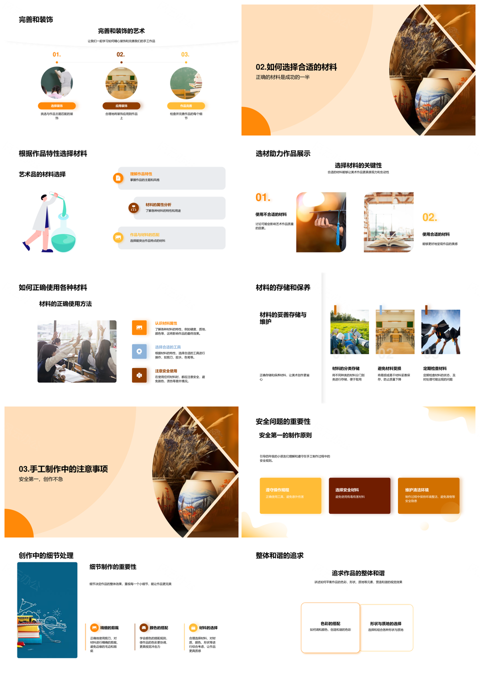 风云办公提供的手工艺达人教学选材设计制作安全创意PPT模板,下载格式为pptx,一共29页,作品中文字及图均可以修改和编辑,图片更改请在作品中右键图片并更换,文字修改请直接点击文字进行修改。
