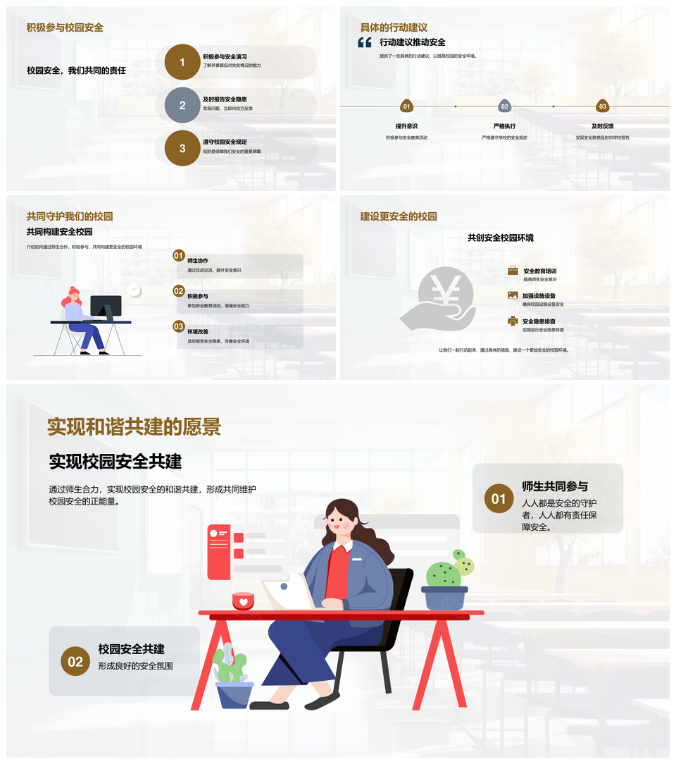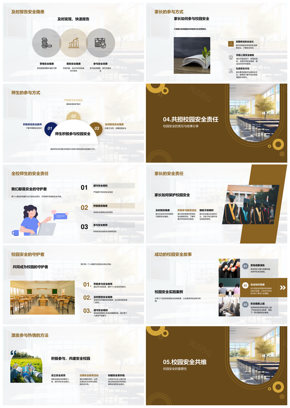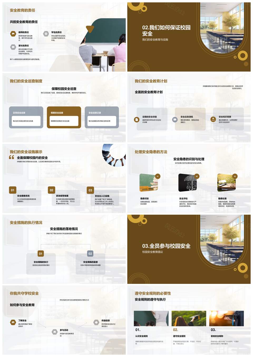 这是一张校园安全全员参与共建巡查消除隐患守则PPT模板,包含校园、安全、全员、参与、共建、巡查、消除、隐患、守则等主题内容,也可用作校园安全全员参与共建、安全全员参与共建巡查、全员参与共建巡查消除、参与共建巡查消除隐患、共建巡查消除隐患守则、校园安全全员参与、安全全员参与共建、全员参与共建巡查、共建巡查消除隐患、巡查消除隐患守则、校园安全全员、安全全员参与、全员参与共建、参与共建巡查、巡查消除隐患、消除隐患守则等PPT场景使用。 风云办公提供的校园安全全员参与共建巡查消除隐患守则PPT模板,下载格式为pptx,一共33页,作品中文字及图均可以修改和编辑,图片更改请在作品中右键图片并更换,文字修改请直接点击文字进行修改。