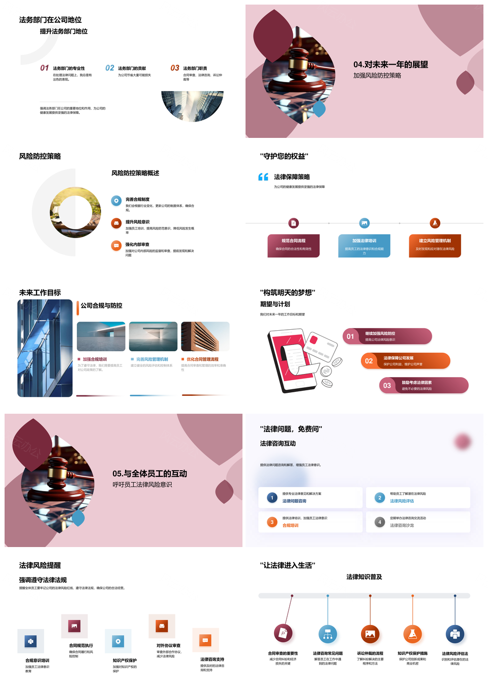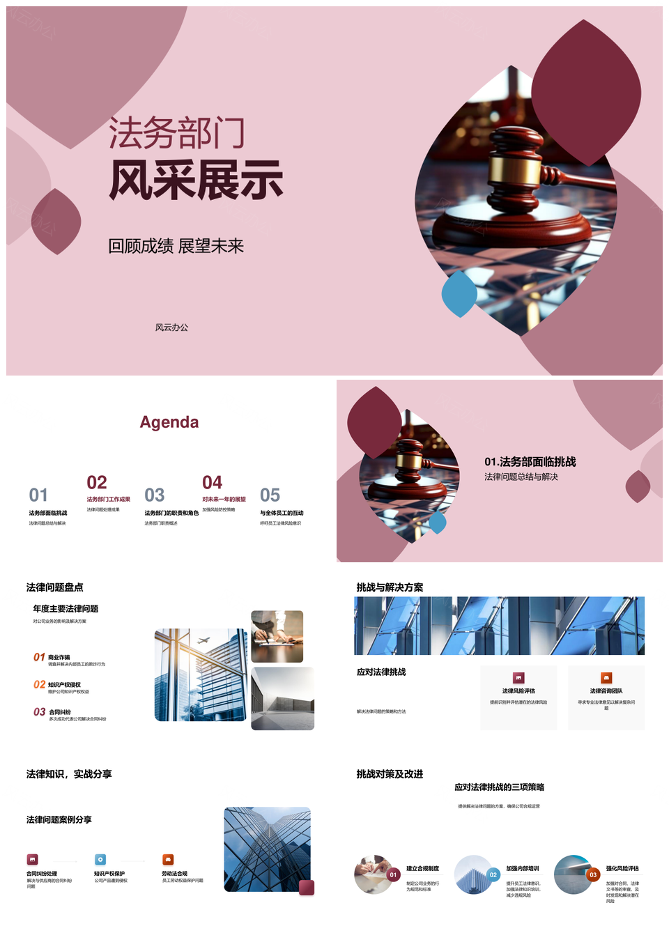 风云办公提供的法务部门法律挑战解决与风险防控风采PPT模板,下载格式为pptx,一共29页,作品中文字及图均可以修改和编辑,图片更改请在作品中右键图片并更换,文字修改请直接点击文字进行修改。