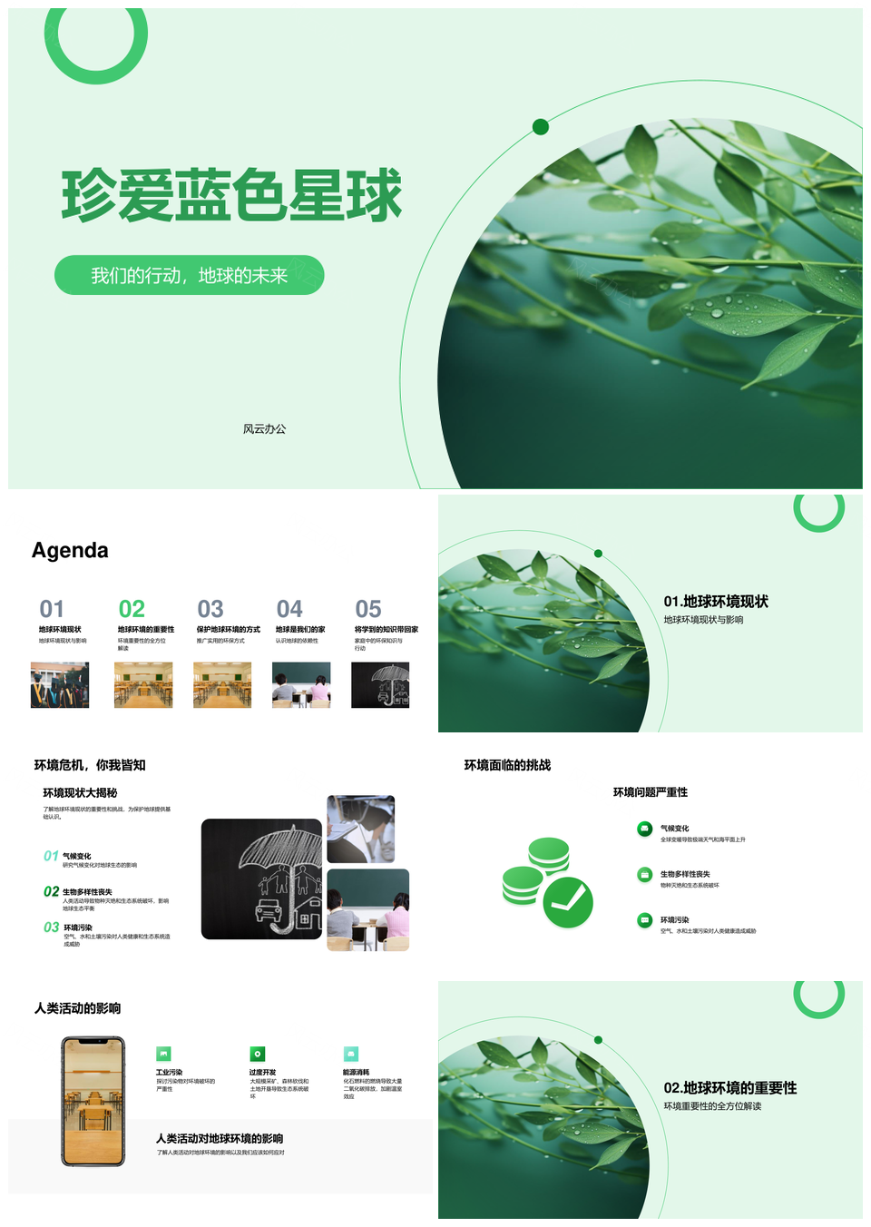 风云办公提供的珍爱地球践行环保教育推动绿色生活PPT模板,下载格式为pptx,一共23页,作品中文字及图均可以修改和编辑,图片更改请在作品中右键图片并更换,文字修改请直接点击文字进行修改。