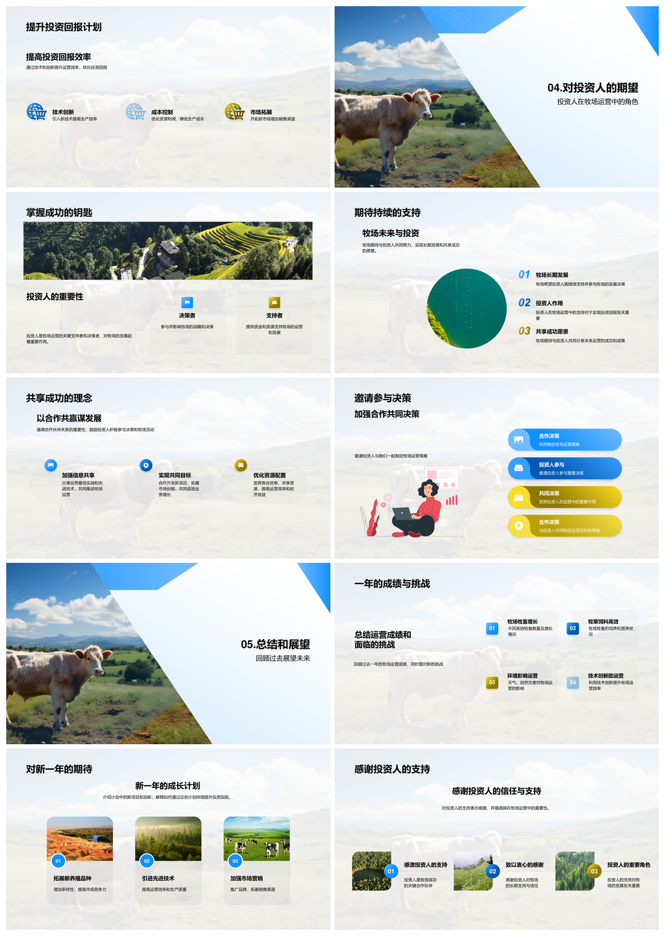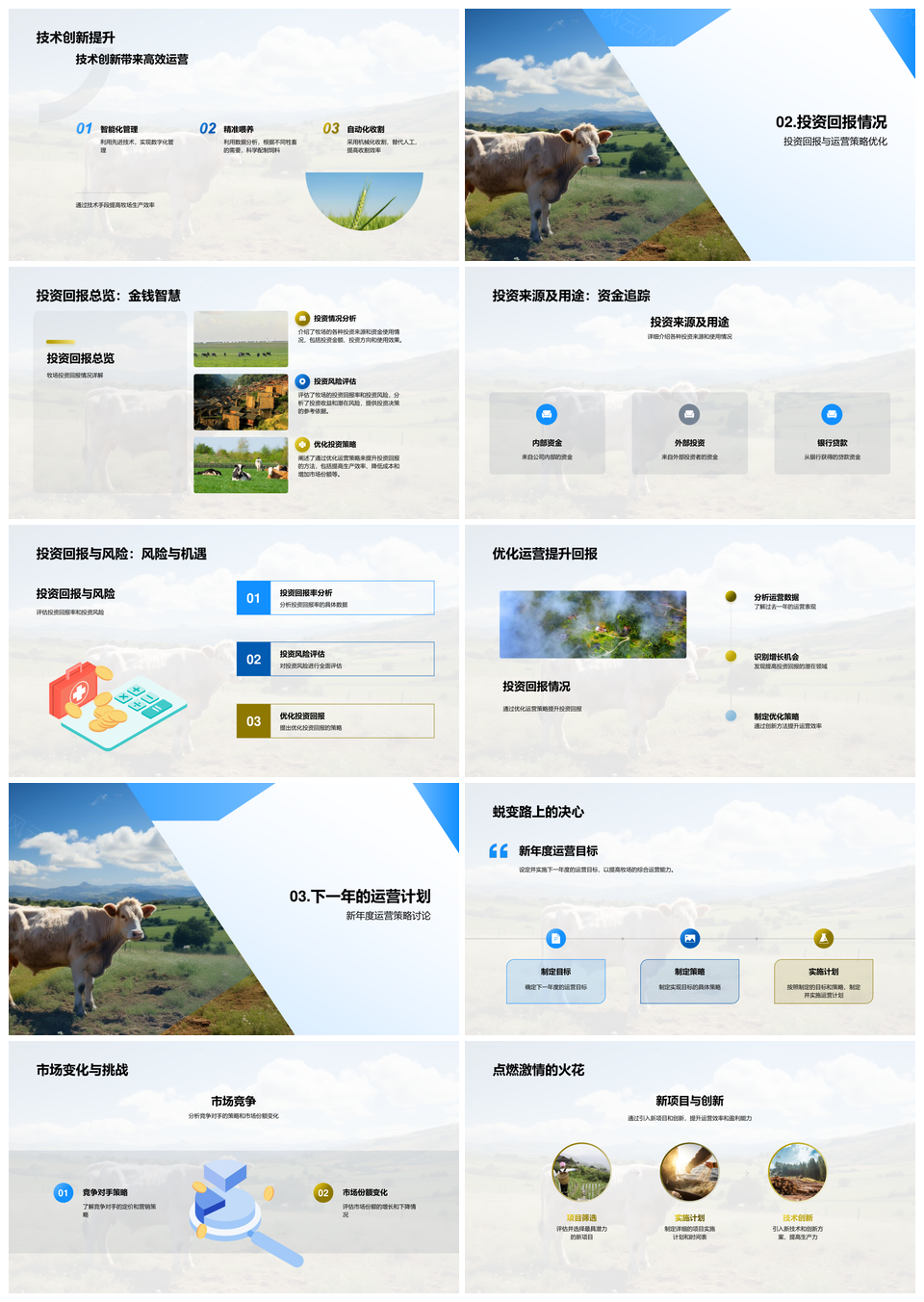 这是一张牧场运营年度投资回报技术创新环境数据分析PPT模板,包含牧场运营、年度投资、回报、技术创新、环境、数据分析等主题内容,也可用作牧场运营年度投资、运营年度投资回报、年度投资回报技术、投资回报技术创新、回报技术创新环境、技术创新环境数据、创新环境数据分析、牧场运营年度、运营年度投资、年度投资回报、投资回报技术、回报技术创新、技术创新环境、创新环境数据、环境数据分析等PPT场景使用。 风云办公提供的牧场运营年度投资回报技术创新环境数据分析PPT模板,下载格式为pptx,一共29页,作品中文字及图均可以修改和编辑,图片更改请在作品中右键图片并更换,文字修改请直接点击文字进行修改。