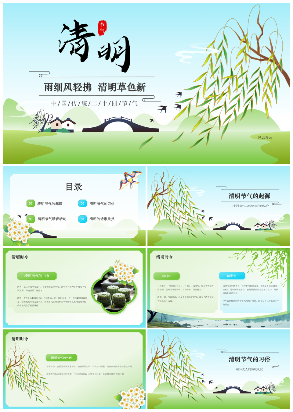 风云办公提供的清明国潮节气祭祖扫墓踏青赏花春游PPT模板,下载格式为pptx,一共21页,作品中文字及图均可以修改和编辑,图片更改请在作品中右键图片并更换,文字修改请直接点击文字进行修改。