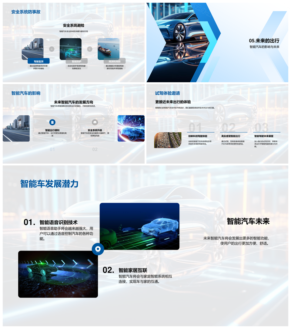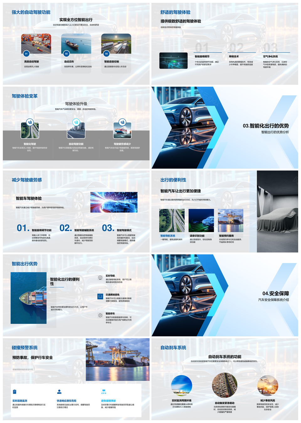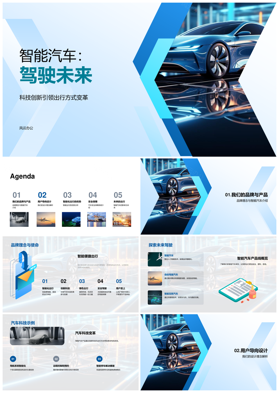 这是一张智能汽车科技创新引领未来自动驾驶出行PPT模板,包含智能汽车、科技创新、引领、未来、自动驾驶、出行等主题内容,也可用作智能汽车科技创新、科技创新引领未来、自动驾驶引领未来出行、智能科技引领未来、智能汽车引领未来、汽车科技创新引领、创新引领未来出行、智能汽车科技、科技创新未来、自动驾驶出行未来、未来自动驾驶出行、引领未来出行、智能汽车创新、科技引领未来、自动驾驶科技创新等PPT场景使用。 风云办公提供的智能汽车科技创新引领未来自动驾驶出行PPT模板,下载格式为pptx,一共23页,作品中文字及图均可以修改和编辑,图片更改请在作品中右键图片并更换,文字修改请直接点击文字进行修改。