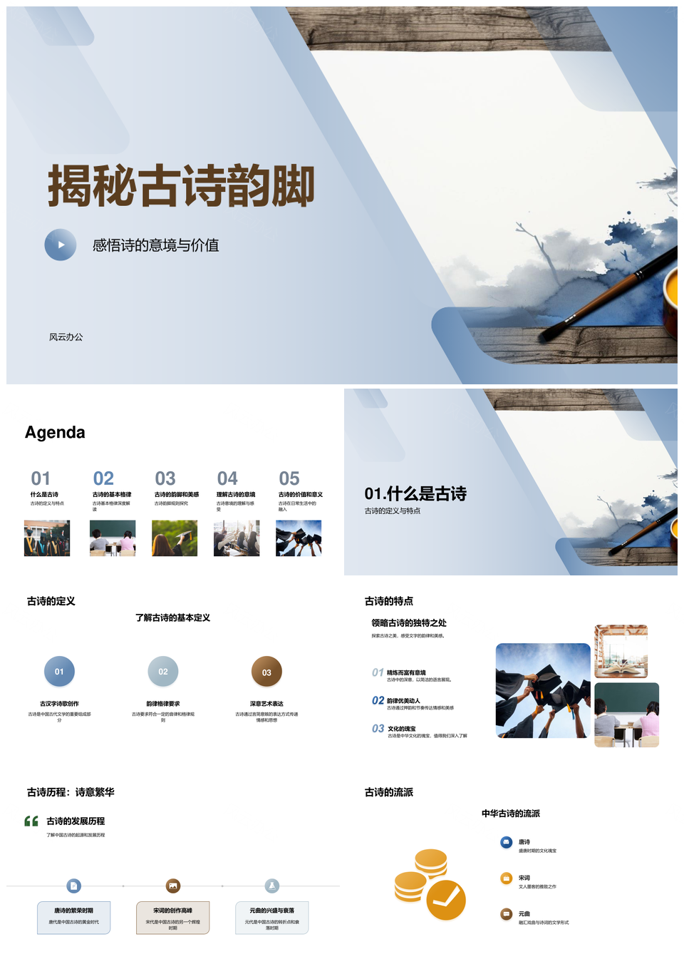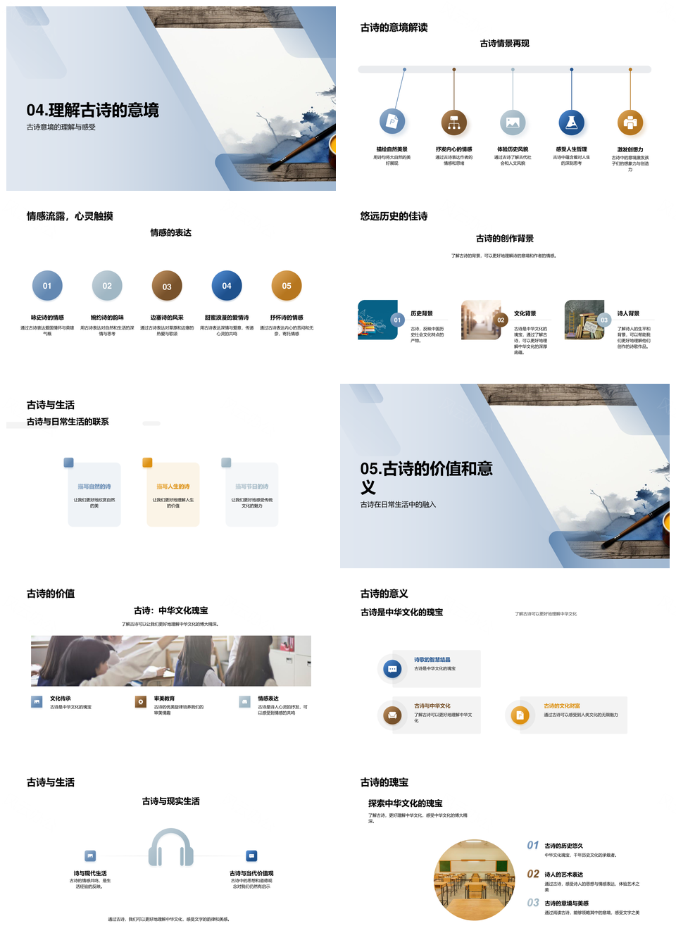 这是一张古诗七言五言韵律结构中的中华文化价值PPT模板,包含古诗、七言、五言、韵律结构、中华文化、价值等主题内容,也可用作古诗七言五言韵律、七言五言韵律结构、五言韵律结构中华、韵律结构中华文化、结构中华文化价值、古诗七言五言、七言五言韵律、五言韵律结构、韵律结构中华、结构中华文化、中华文化价值、古诗七言、七言五言、五言韵律、韵律结构等PPT场景使用。 风云办公提供的古诗七言五言韵律结构中的中华文化价值PPT模板,下载格式为pptx,一共28页,作品中文字及图均可以修改和编辑,图片更改请在作品中右键图片并更换,文字修改请直接点击文字进行修改。