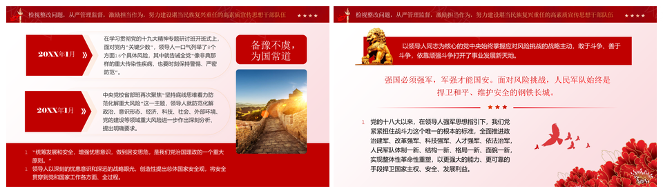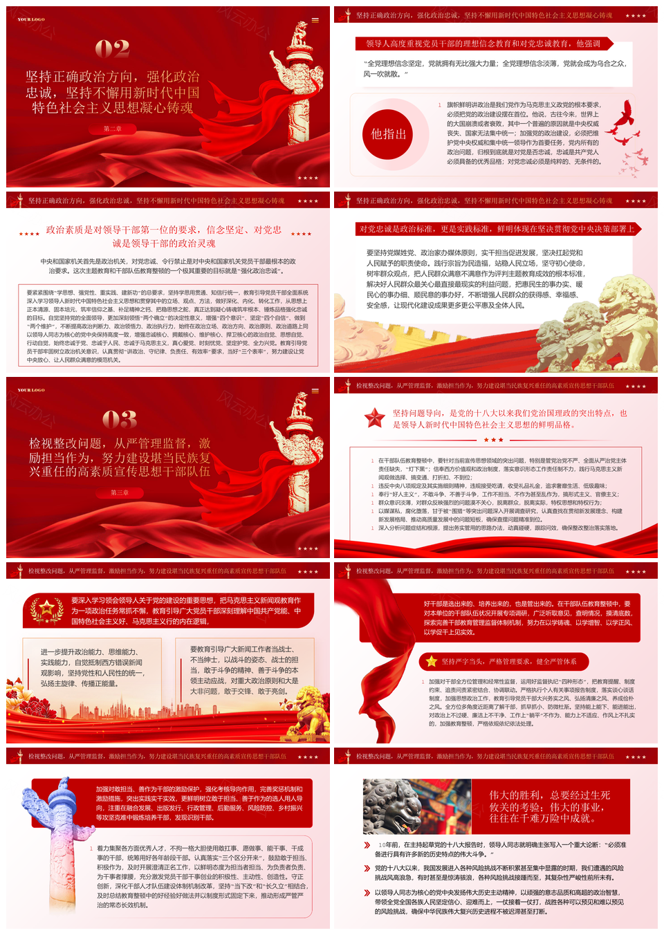 这是一张红色党建引领教育整顿助推干部队伍高质量发展党课PPT模板,包含红色党建、引领、教育整顿、助推、干部队伍、高质量发展、党课等主题内容,也可用作红色党建引领教育整顿助推干部队伍高质量发展、红色党建引领教育整顿助推、教育整顿助推干部队伍高质量发展、党建引领干部队伍高质量发展、助推干部队伍高质量发展、干部队伍高质量发展党课、教育整顿助推高质量发展党课、红色党建引领干部队伍、红色党建引领教育整顿、红色党建助推干部队伍、党建引领教育整顿、教育整顿助推干部、教育整顿干部队伍、干部队伍高质量发展、高质量发展党课等PPT场景使用。 风云办公提供的红色党建引领教育整顿助推干部队伍高质量发展党课PPT模板,下载格式为pptx,一共20页,作品中文字及图均可以修改和编辑,图片更改请在作品中右键图片并更换,文字修改请直接点击文字进行修改。